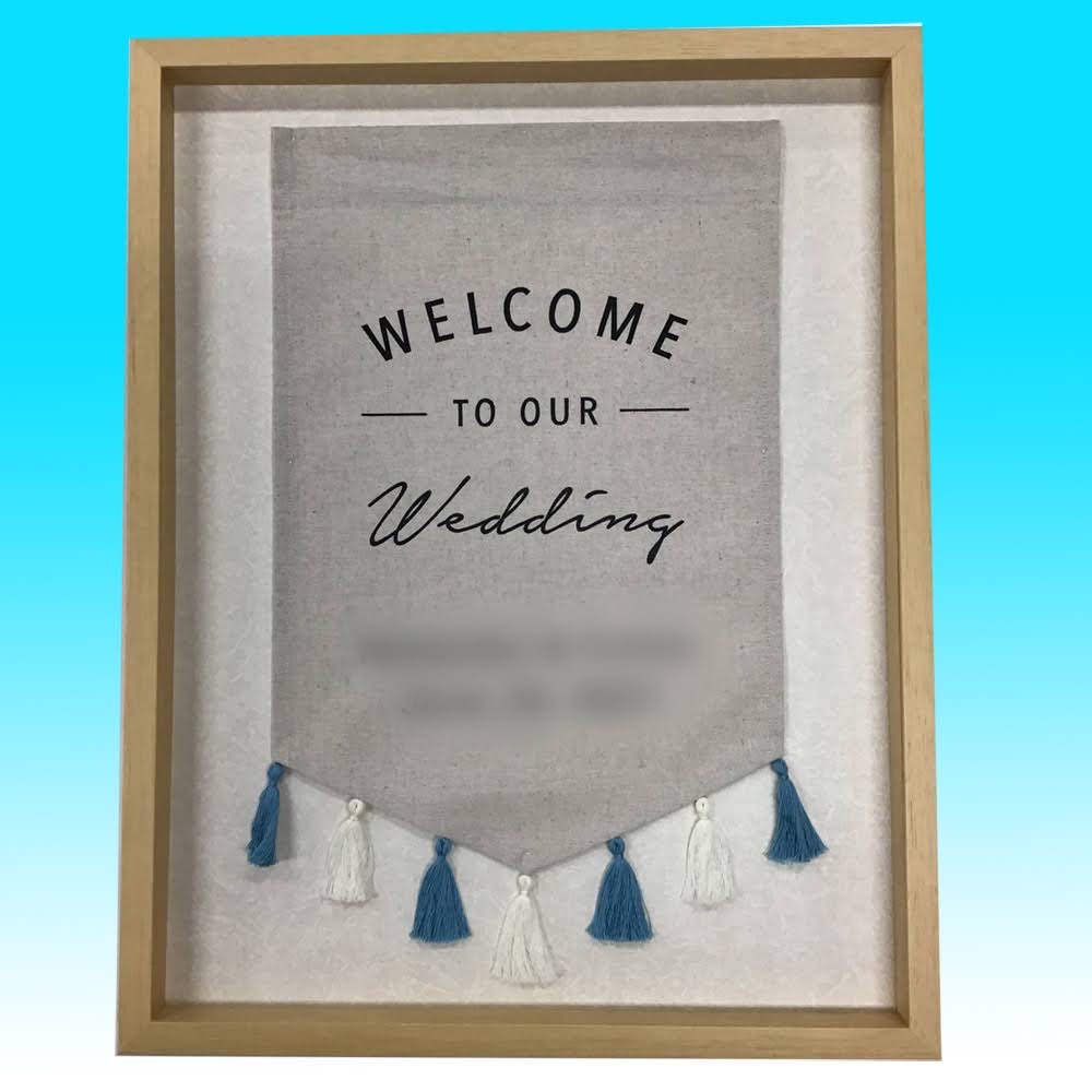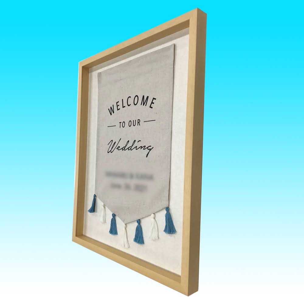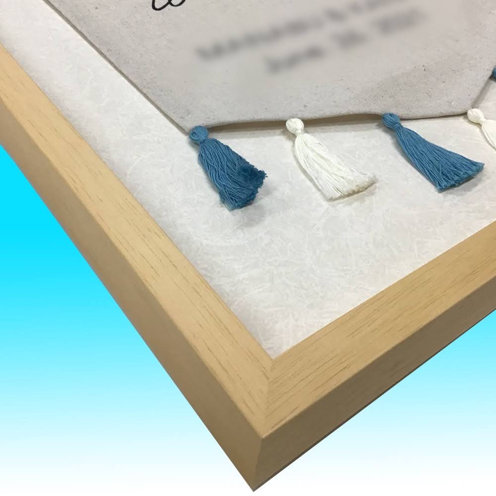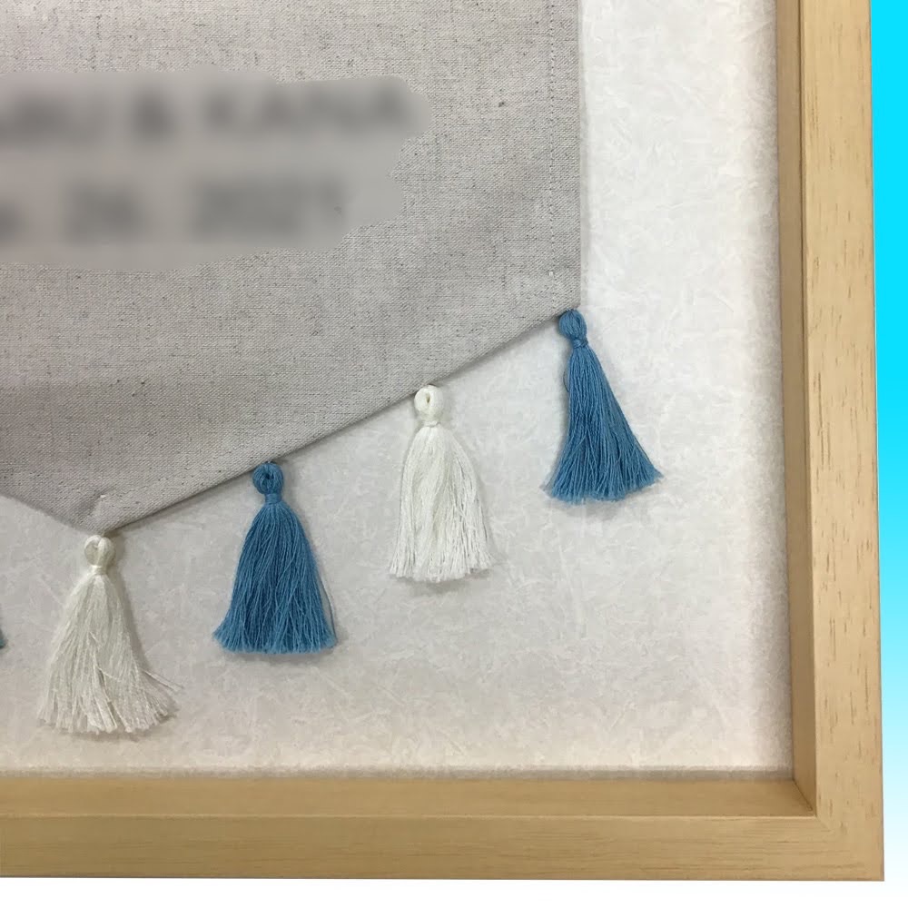 ウェディングタペストリーを額装しました!お客様が結婚式に使用した思い出の品です! タペストリー吊り下げるためのバーと紐は外し、マットに縫い付ける形で額装しました。立体額なので額の中には空間があり、タペストリーの青と白の房は揺らすとそれに合わせてフリフリ揺れます^_^ 使用したフレームは「7916希 ナチュラル 半切」、背景として少し模様のある白色マット(20101)を使いました。