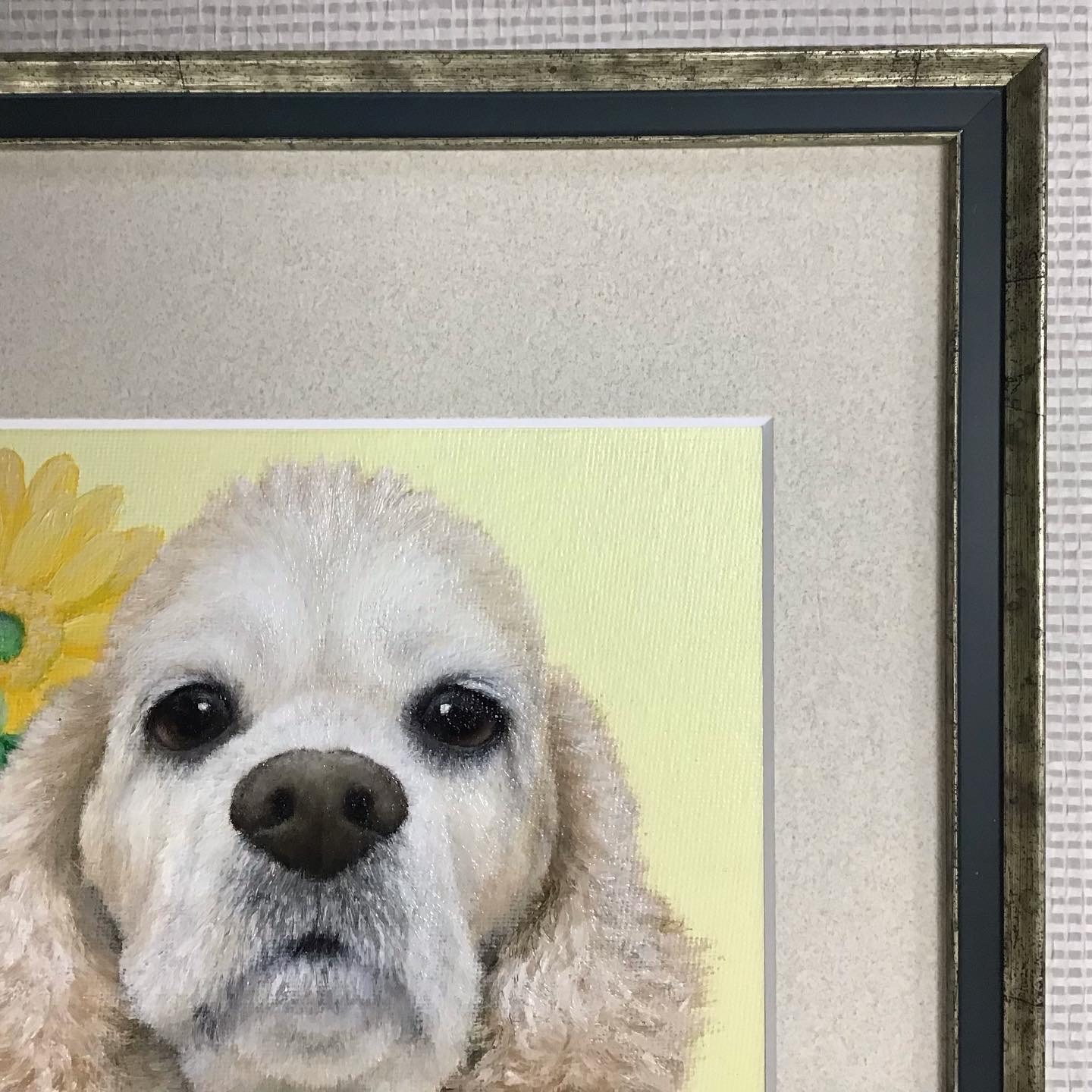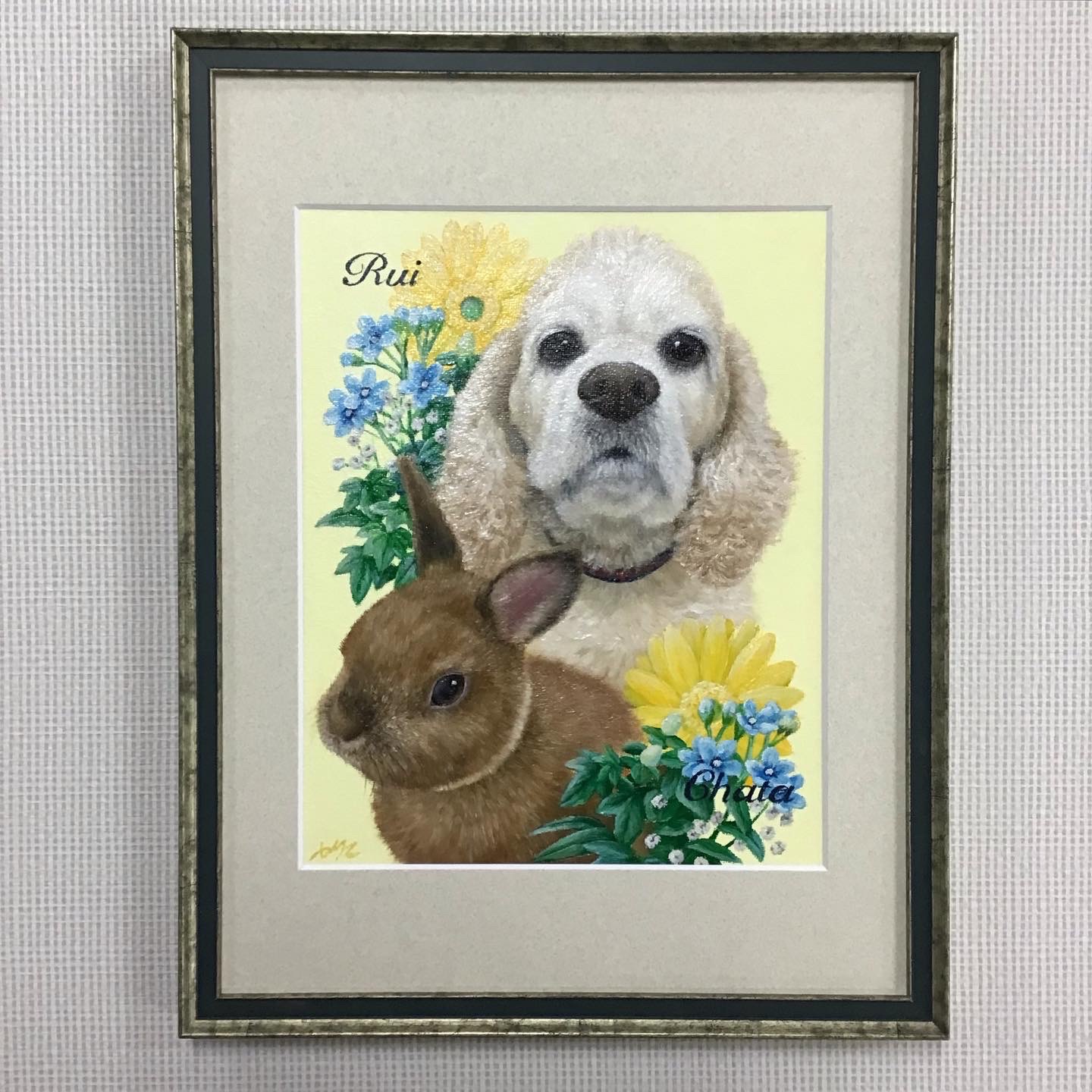 アクリル画を額装しました! 描かれているのはお客様の愛犬ルイくんと愛兎ちゃたくんです! 3mmほどの厚みのあるキャンバスボードに描かれた作品なので、入れ方としてはピッタリサイズの油絵用フレームに入れるか、ある程度内部の深さがある水彩用のフレームを使ってマット等で調整して入れるかのどちらかで、今回は後者のパターンで額装しました! 使用したフレームは「5901 Sグリーン 太子」、マットはコルク色マット(19002)です。