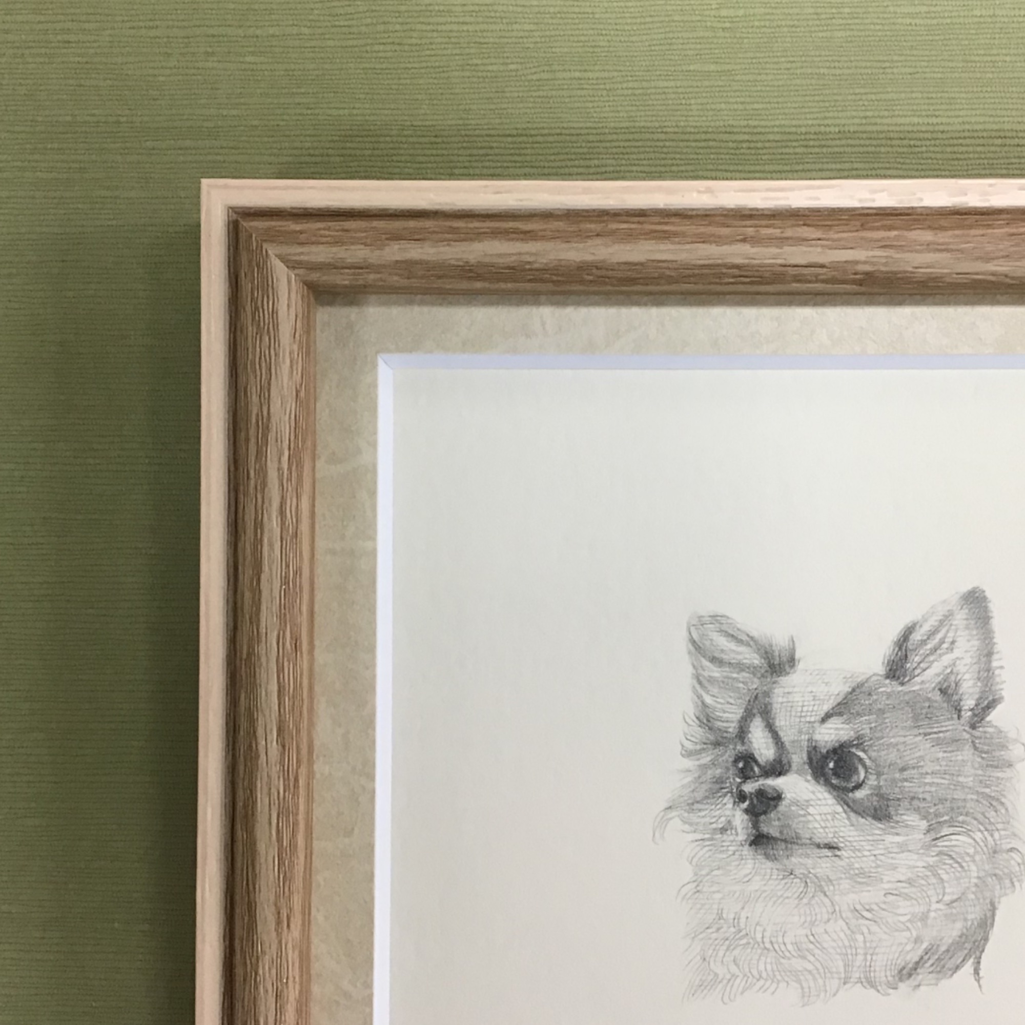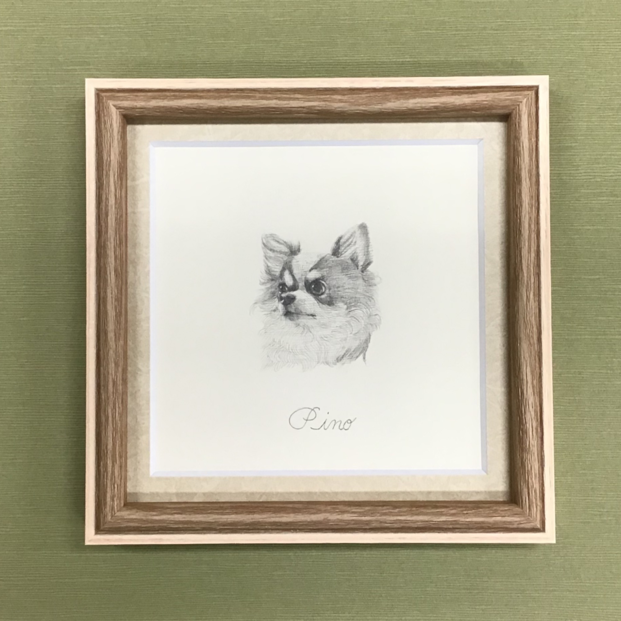 えんぴつ画を額装しました。 描かれているのは、プレゼントされる方のお宅にいるワンちゃんの「Pino」ちゃんです! 使用したフレームは「ノースフレームPS オフホワイト/15角」、マットは表面に漉いた紙のような模様の入った「20102 もみ紙肌色」です。 大切な家族をこんなに素敵に描いていただけたら、とっても嬉しいですね! 贈られた方もきっと喜んでくださったことと思います!