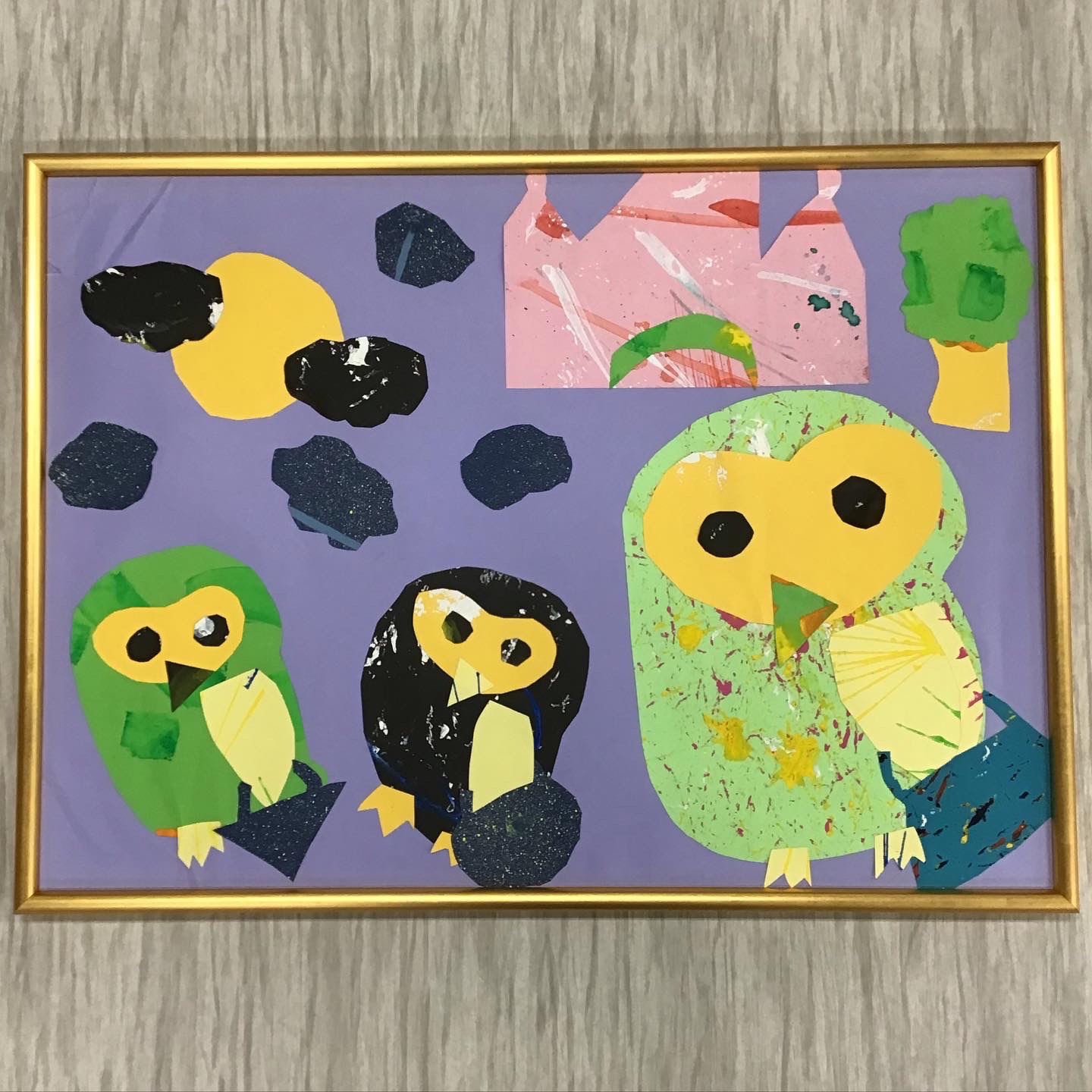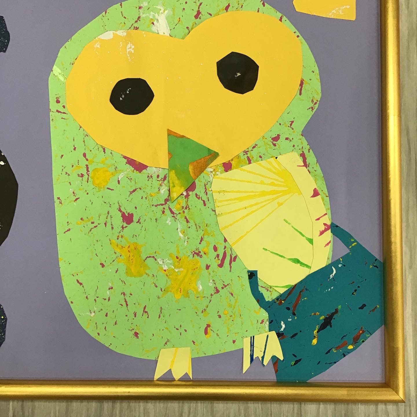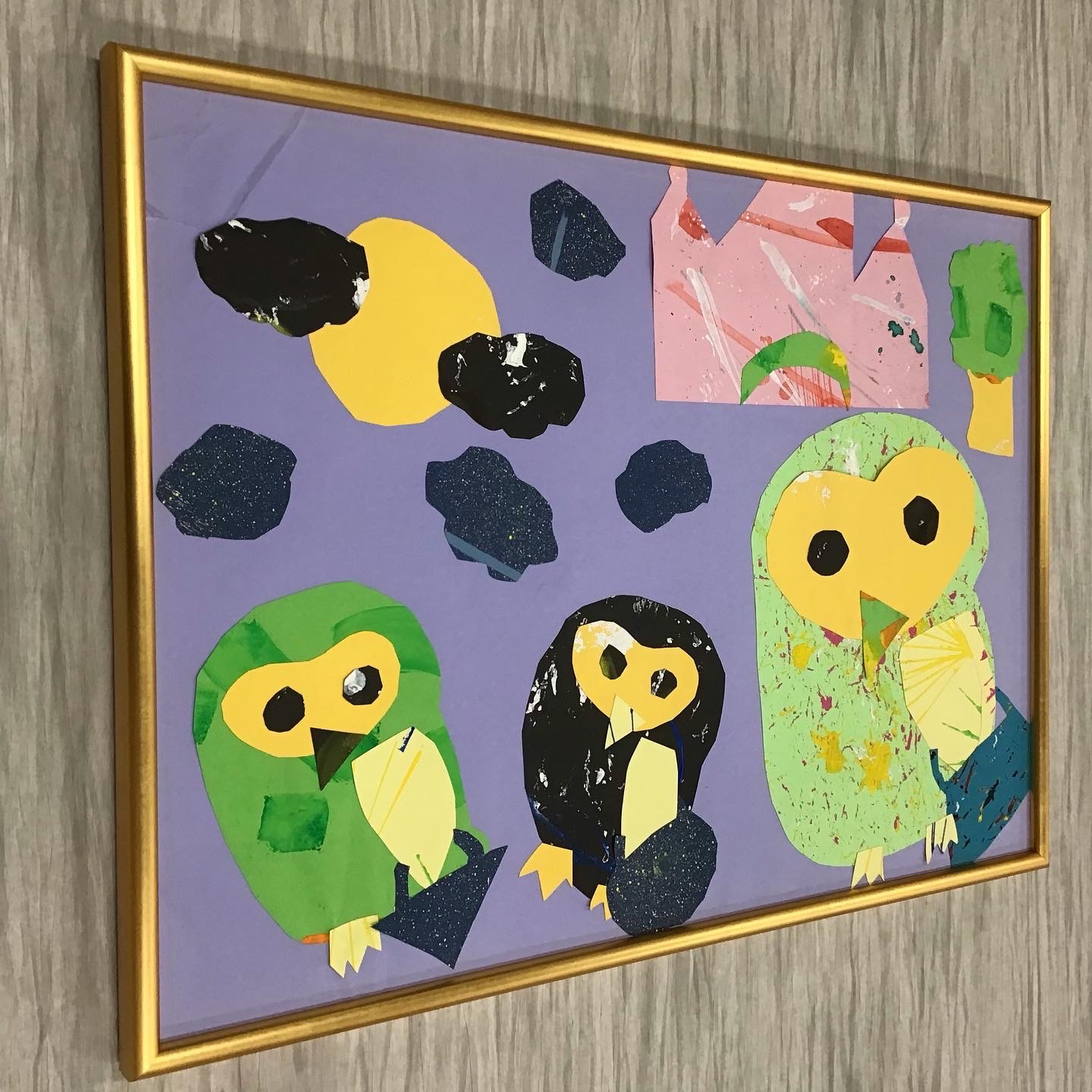 3匹のふくろうが可愛い学童画を額装しました! ふくろうや夜空に浮かぶ満月、おそらく奥に見えるのは建物でしょうか?全て紙で表現された作品で、題名は「真夜中のふくろう親子」です! お客様のお孫さんの作品だそうです^_^ 使用したフレームはゴールドのかまぼこ型フレーム「B-00010R」で、ピッタリサイズでオーダー制作しました!