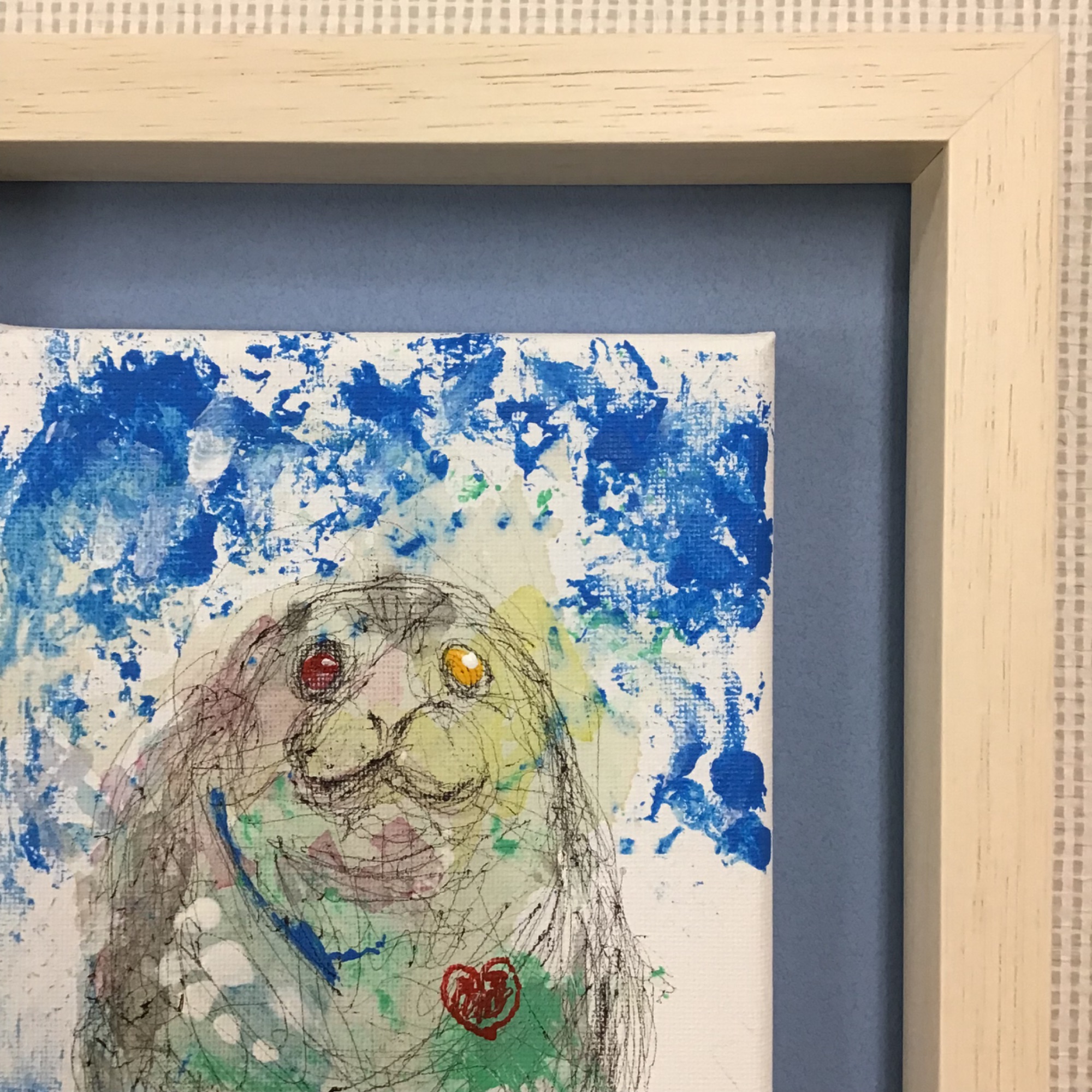 キャンバス画を額装しました! くりんとした目が可愛いアザラシが描かれています。 約130mm×180mmのキャンバス画で、厚みもあるのでなかなかピッタリはまるフレームがありません。ひと回り大きな額の「7916歩 ホワイト インチ」に裏からネジで固定する方法で額装しました! 背景として、水色のマット(11270)を使用しています。