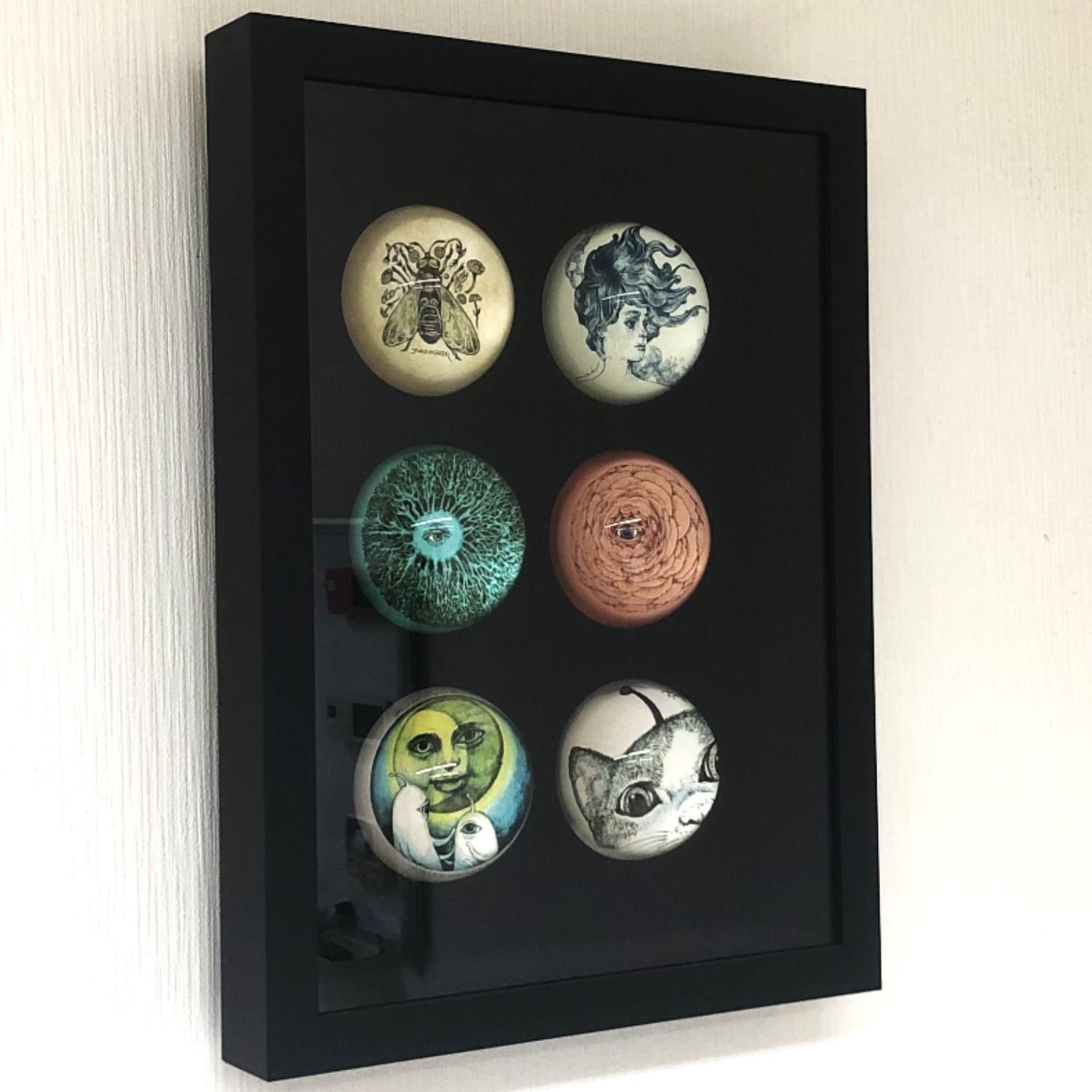 ヒグチユウコさんのペーパーウェイト6種を額も内側もマットブラックの立体額にしました。ペーパーウェイトは一個500gあり、強力な接着剤で固定。モノリスの様な漆黒の額内に浮き上がり、とても綺麗なカッコいい仕上がりになりました。