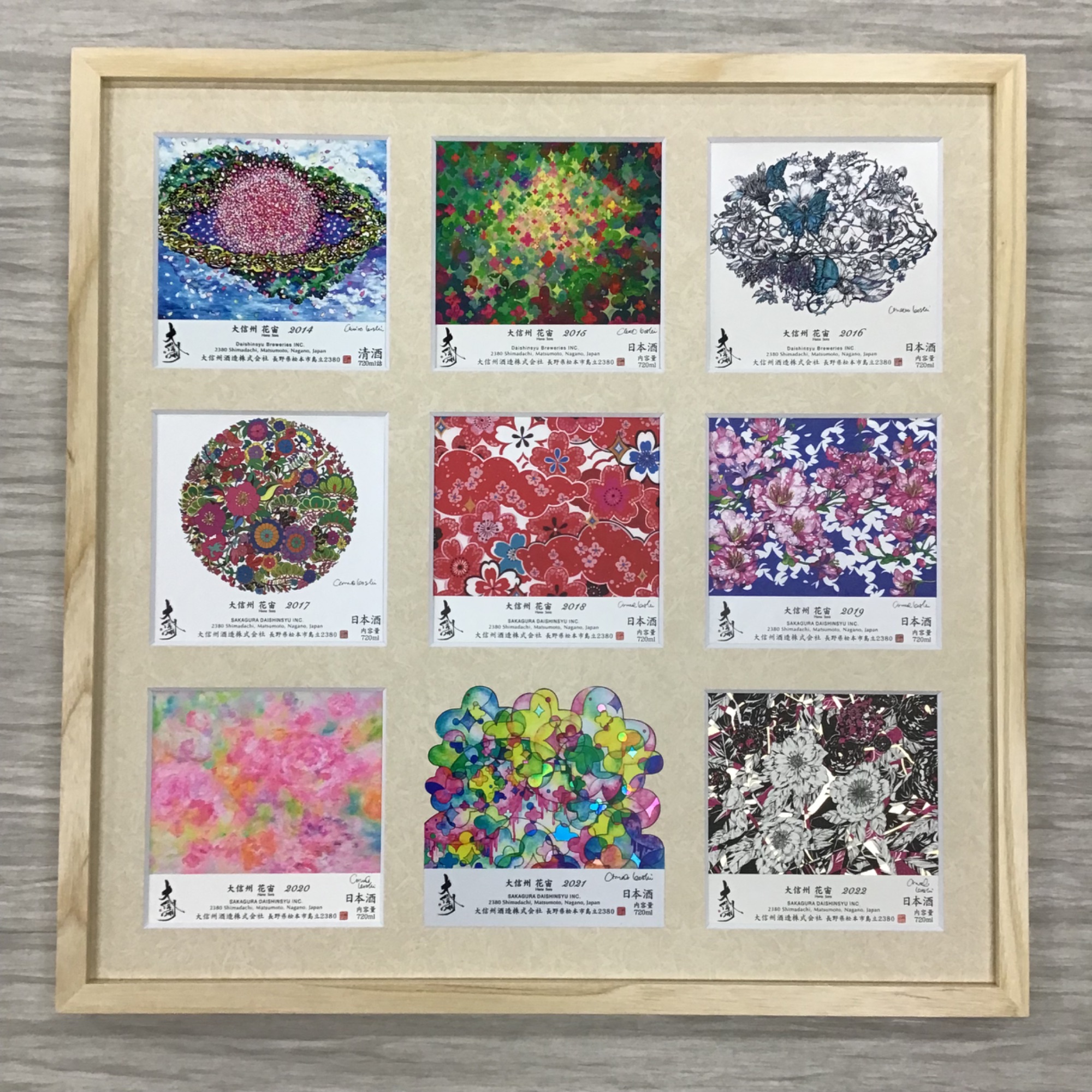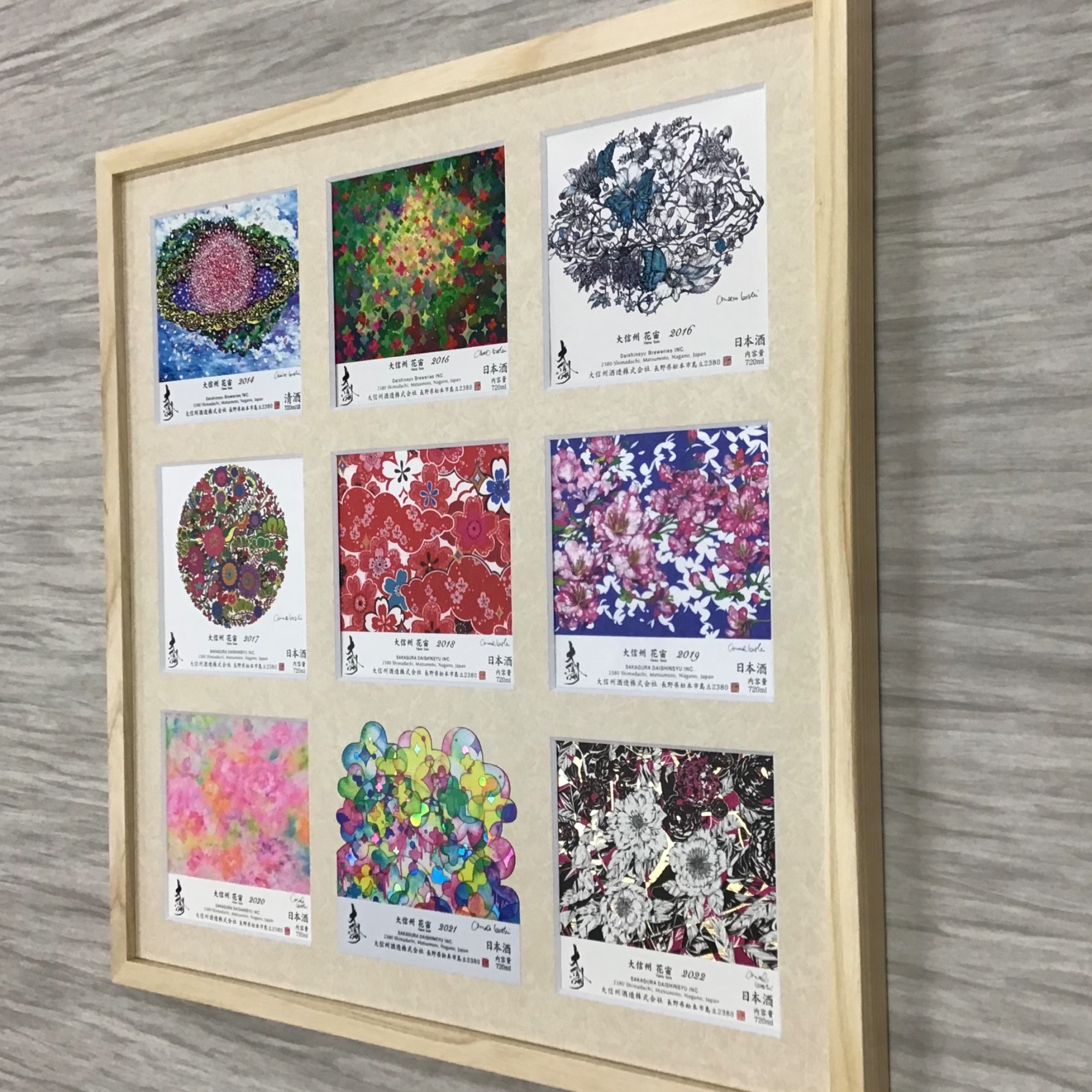 大信州 花宙(はなそら)のラベル(2014〜2022)を額装しました! 「大信州の創作活動と、越ちひろさんの創作活動の融合」をコンセプトに大信州酒造様から販売されている人気の日本酒「大信州 花宙」、長野県出身の女性画家・越ちひろ様がラベルデザインを担当されているそうです!とっても華やかでおしゃれなラベルですね💕 使用したフレームは「GT501 木地 40角」、マットは少し模様のあるベージュ色マット(20102)です。 ラベルごとに窓抜きされていますが、2021のラベルだけなかなか特殊な形だったので、シールになっていたこともあり、マットに直接貼ってあります!