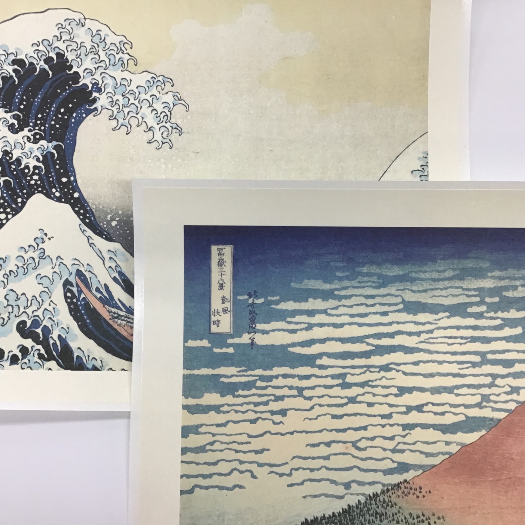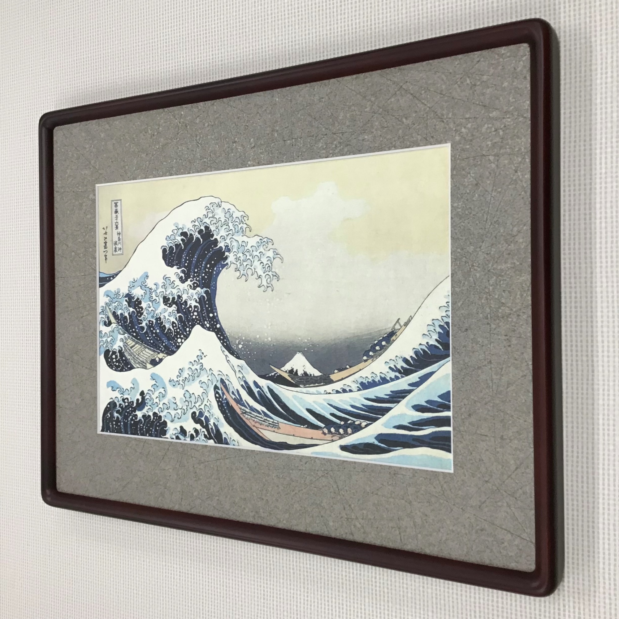 浮世絵を額装しました。 日本を代表する浮世絵師、葛飾北斎の描いた富嶽三十六景の「神奈川沖浪裏」と「凱風快晴」です。 使用したフレームはどちらも「D717 セピア/大衣サイズ」、マットは「22141 白芯グレー」です。 今回は複製画ということで、お客様とのご相談の結果、額装に際して「裏打ち」作業をさせていただきました。 歴史的に貴重なものや、手を加えると価値が下がってしまうようなお品の場合は、極力作品への加工はしないほうが良いです。 しかし、長期的に飾ることを考えた場合、湿気などによる波打ちを防止する観点からは、完成した額装の状態を保つことができるので、複製画などの際は裏打ちをおすすめしています。 もし加工が必要かどうか迷う際は、ぜひお気軽にスタッフへご相談ください。