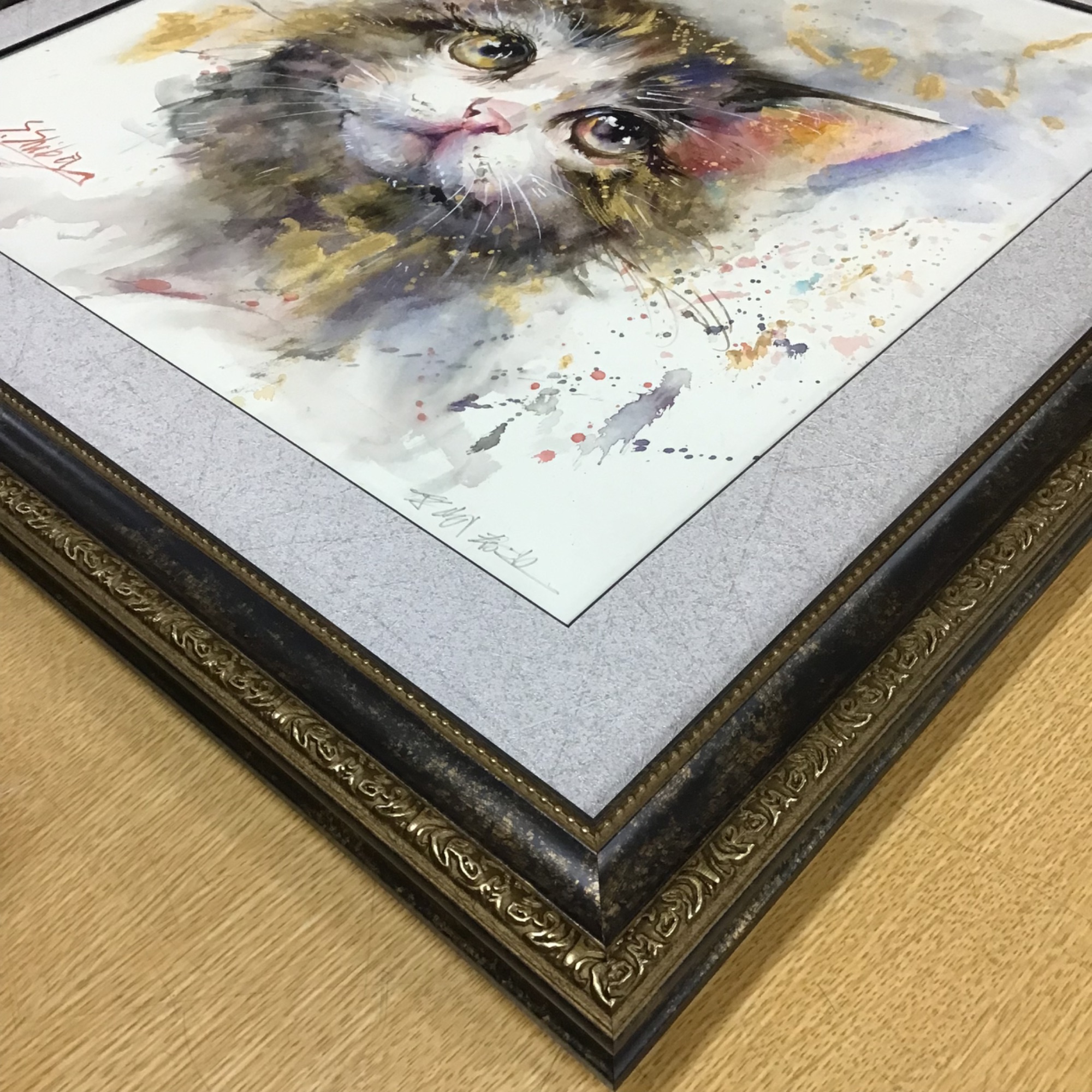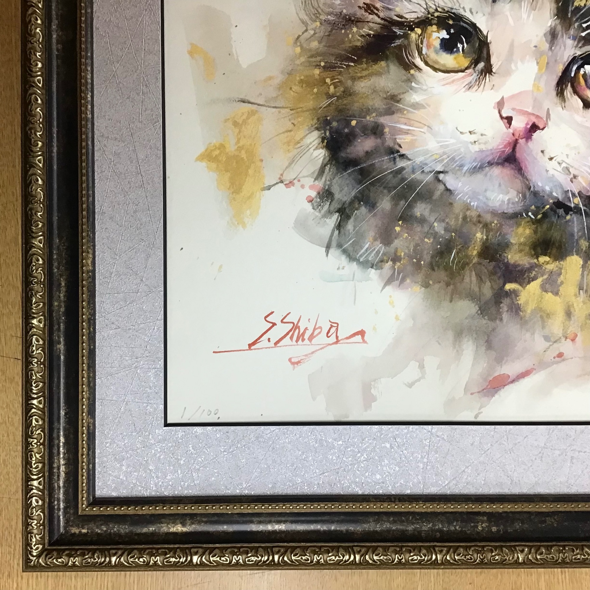 柴崎春通「愛02/Love 02」のジクレー版画を額装しました。 YouTubeにて「おじいちゃん先生」と親しまれている画家・柴崎春通氏...画材を選ばず描く作品は素敵なものばかりです✨ 柴崎春通氏のファンであるお客様のために娘さんがプレゼントしてくれたそうです〜😊 使用したフレームは描かれている猫ちゃんのようなブラウンとゴールドが混ざった色合いのフレーム「1644 ブラック50角」、マットは光沢のあるシルバーのようなホワイトのような色合いで切り口が黒のマット(22138)です。