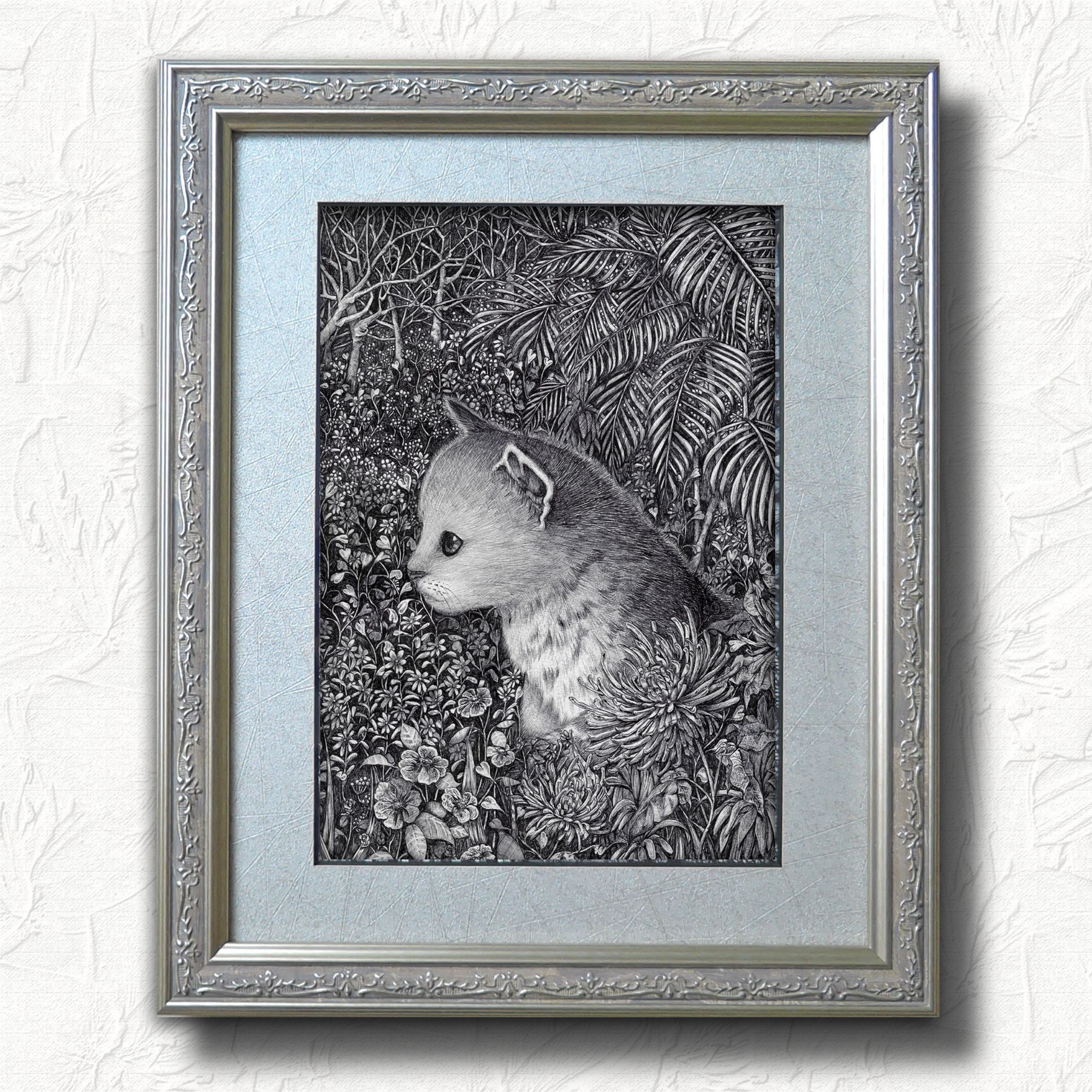「尊き小さな命たち」と題して、子猫とキラキラ輝く植物たちを描きました。華麗さと落ち着き具合のバランスを考え、シルバー系の装飾額とマットの組み合わせを選択しました。