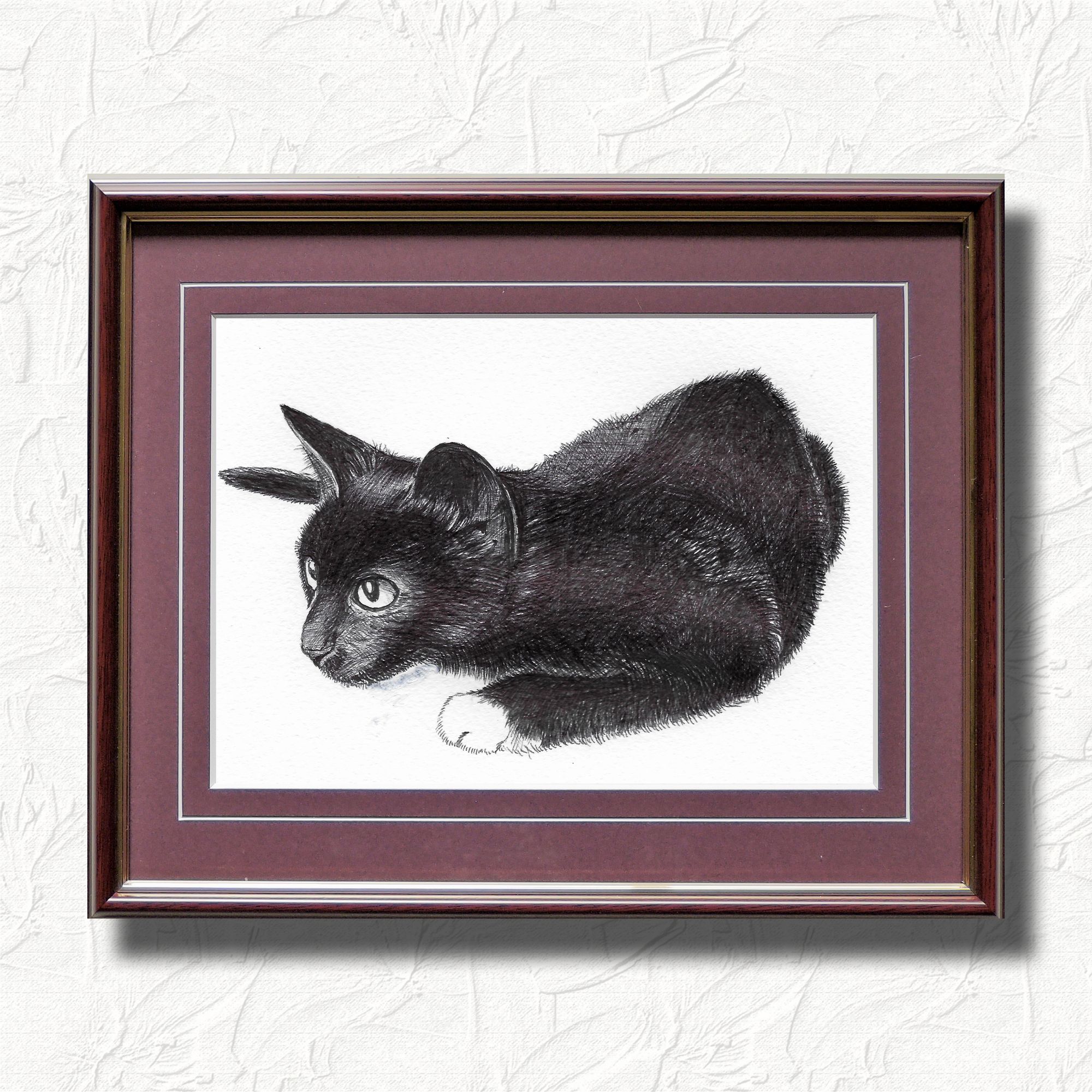 大好きな黒猫をシンプルにすっきりと描きました。シックなパープルマットとマホガニーフレームに入れて、黒猫らしい雰囲気に仕上げてみました。