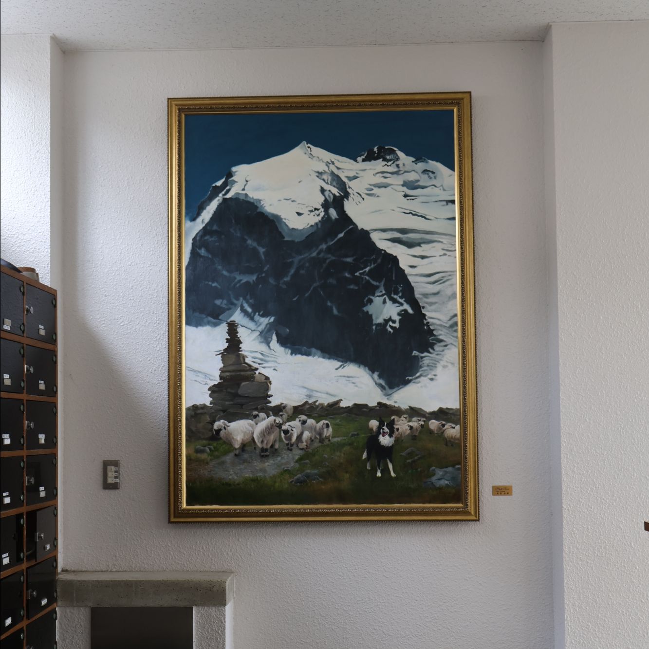タカハシさんの額縁9390・LT面金仕様で母校に絵を寄贈できました。額吊金具は セフティワイヤー自在[大]2本がけです。