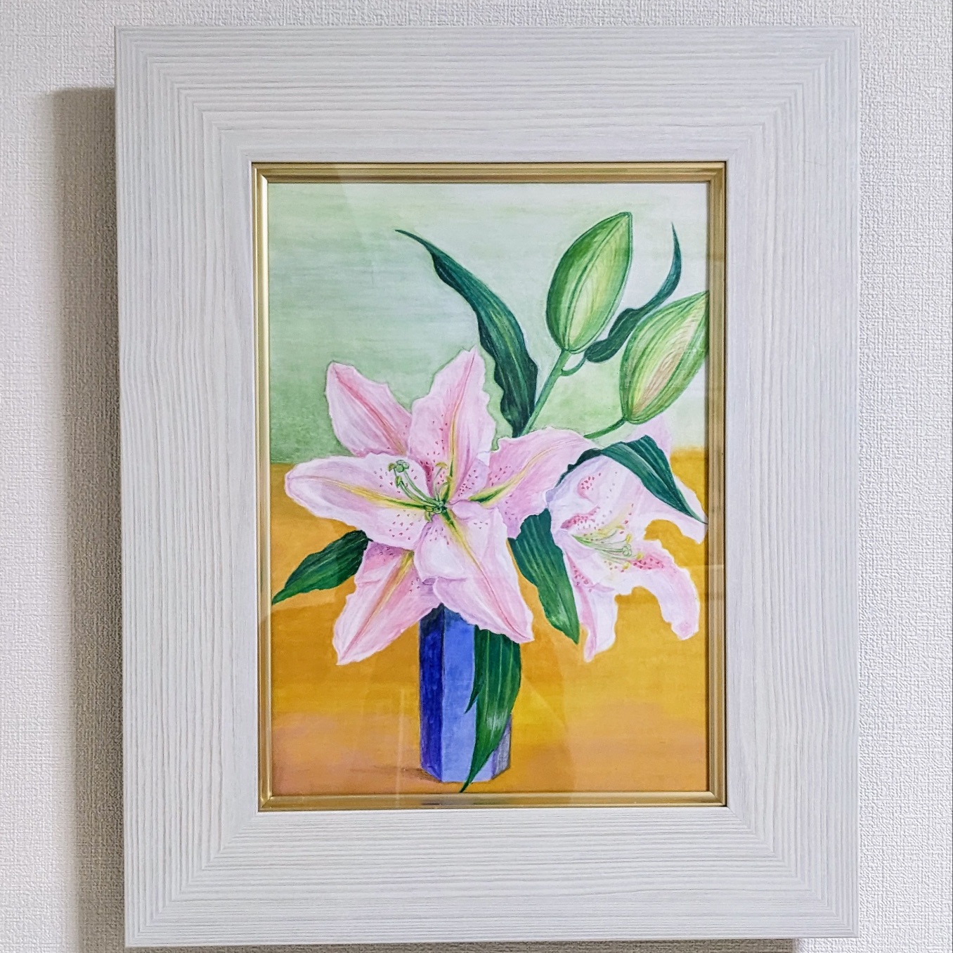ナチュラルな白のフレームを合わせて清々しい百合の花の絵が引き立ちました