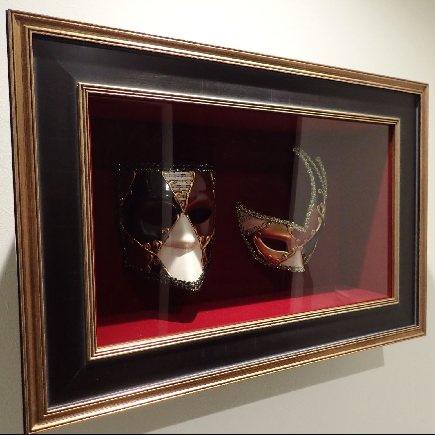 一昨年新婚旅行でイタリア・ベェネツィアに行った際、ちょうどカーニバルが開催されていて、記念に購入したベネチアンマスクを飾るために額縁を制作していただきました。 額の色合い、マットの色彩が素敵でマスクがとても高価に見えます。 正直、マスク二枚の値段を遥かに上回る額になりましたが、とても満足しています(笑)