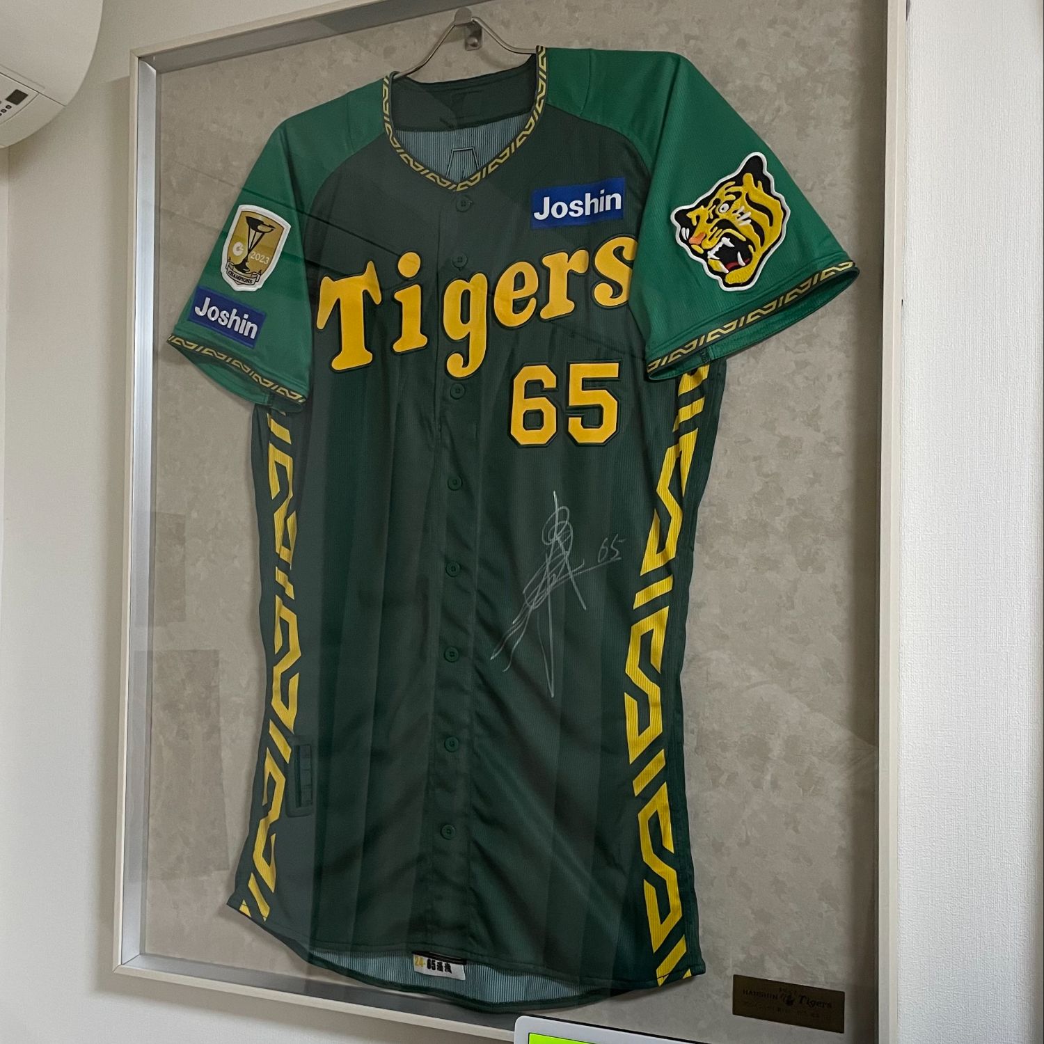 2024年阪神タイガース、ウル虎の夏Ver.ユニフォーム。#65湯浅京己投手です。 実使用品ではありませんが実物・サイン入りです。ユニフォーム額L220を使用、額装してカッコ良くなりました。