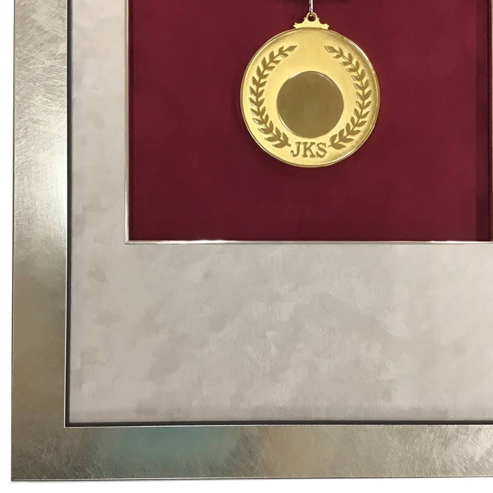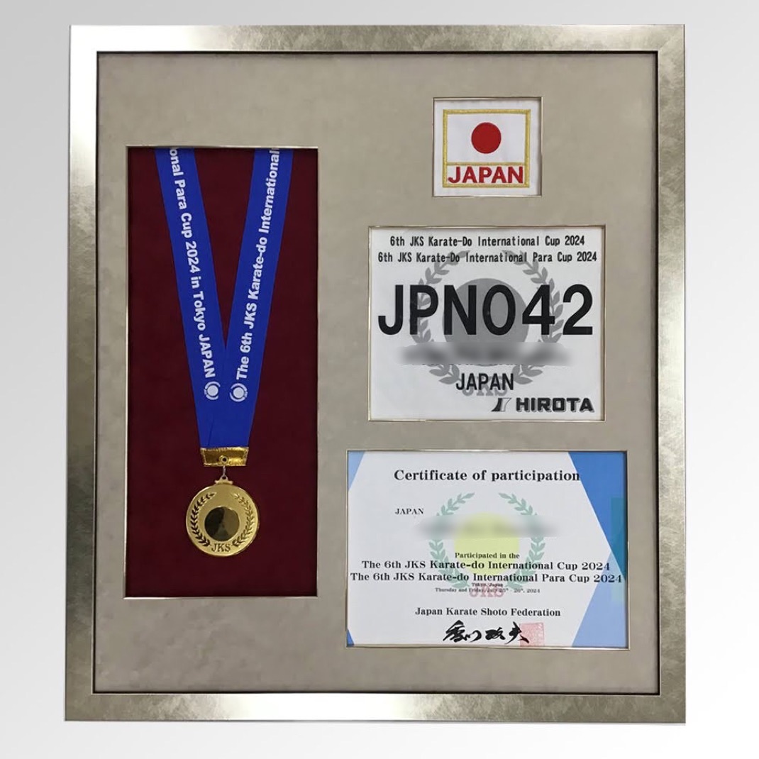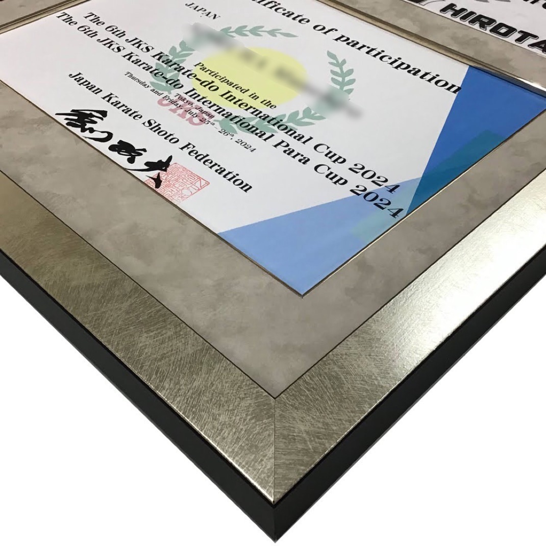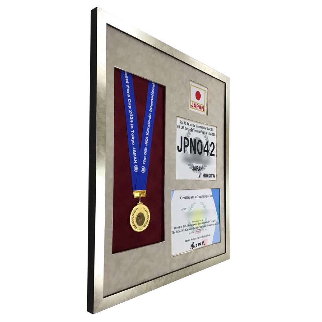 スポーツの秋ということで...スポーツ関連の額装のご紹介です🥋 空手の大会に出場した際に胴着につけていたゼッケンと日本国旗のワッペン...そしてメダルと賞状をまとめて一つの額に額装しました✨ 使用したフレームは「MDF2800 シルバー」、マットはスエードベージュ(24601)に面金加工をしました!メダルの背景はメダルとリボンが目立つようにスエード赤(24605)になってます✨