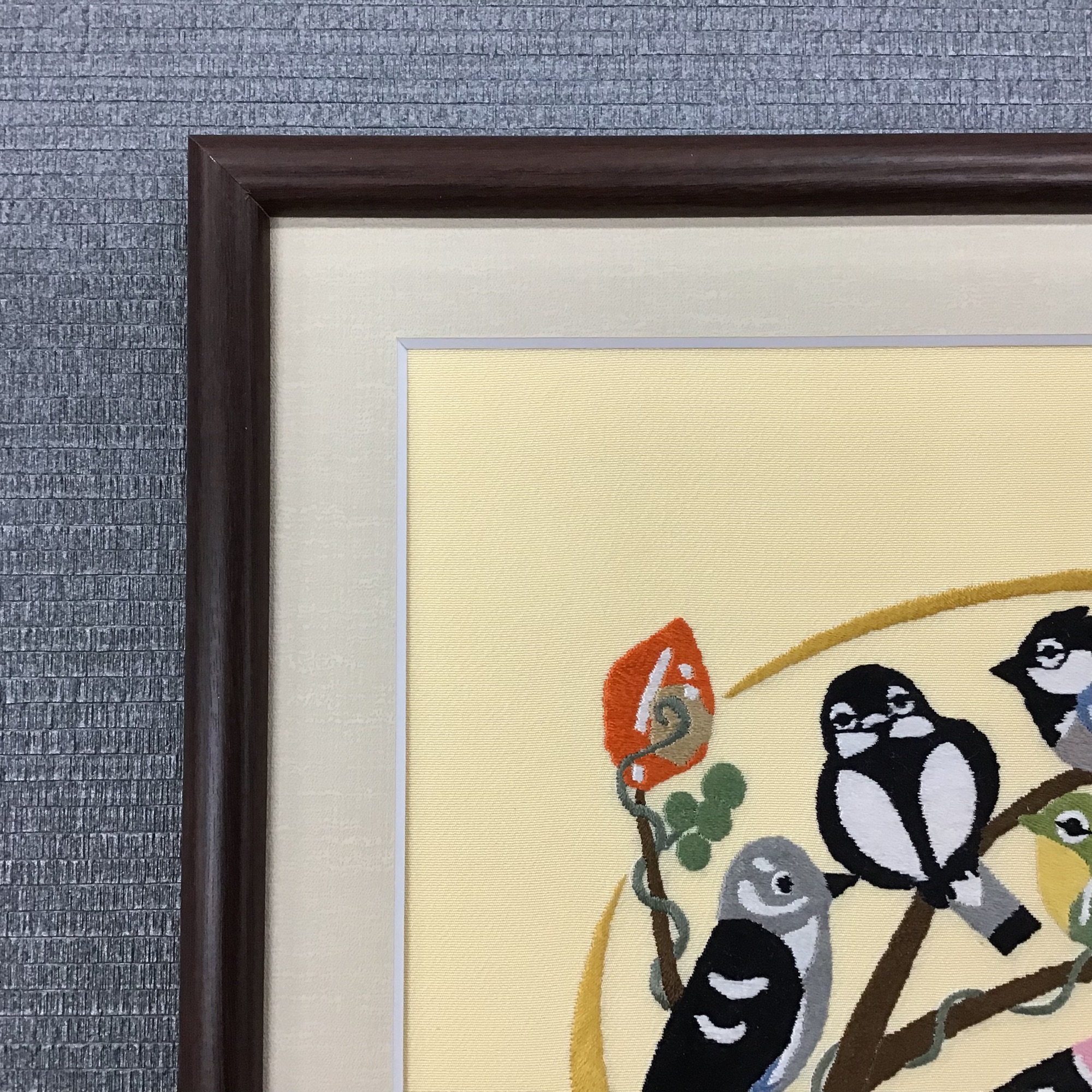 裏打ち加工済みの刺繍作品を額装しました。 種類もさまざまな6羽の小鳥たちが、可愛らしく刺繍されています。 使用したフレームは「BH-W03F セピア/30角」です。マットは、フレームのセピア色と刺繍背景の明るいクリーム色の中間ほどの色をした「10502 ベージュ」を選択し、全体の調和を図りました。 作品の雰囲気にマッチした仕上がりとなりました。 刺繍作品を額装する際、最終的な仕上がりを考えると『裏打ち』加工は必須の作業です。 当店では額装だけでなく、刺繍作品の裏打ち加工も承っておりますので、刺繍作品を額装希望の際はお気軽にご相談ください!