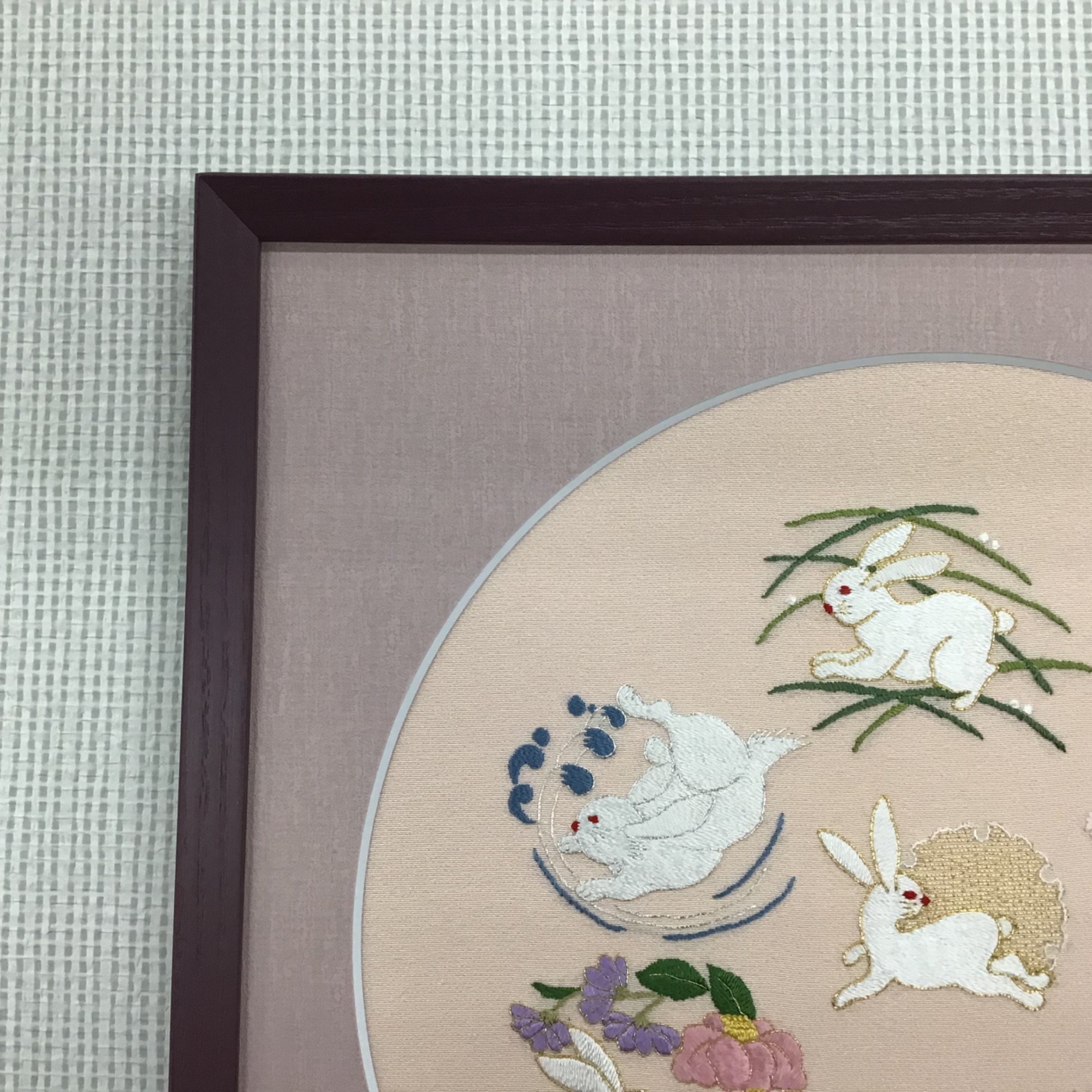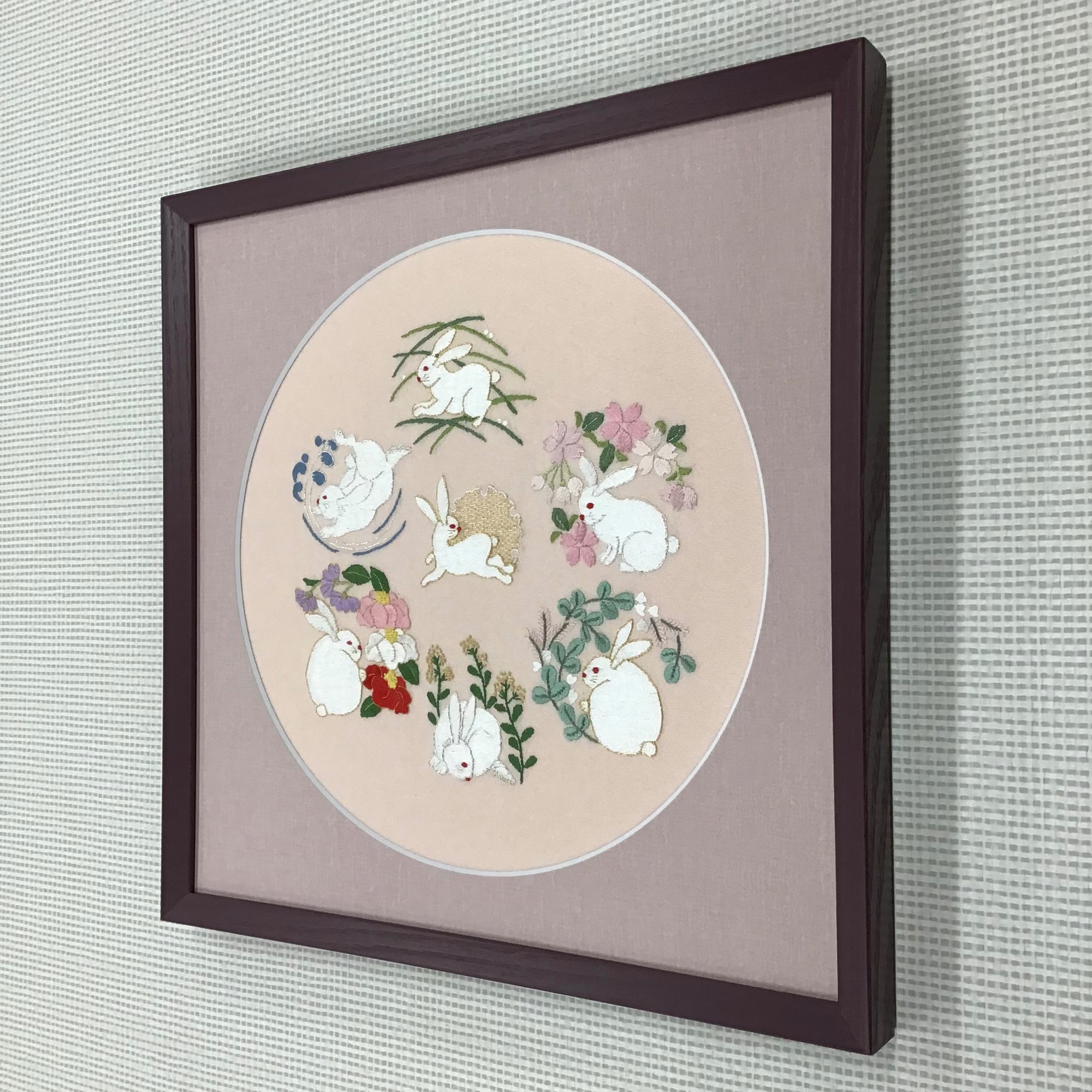 正方形の色紙に仕立てられた、刺繍作品を額装しました。 題材は6羽のウサギ達。それぞれが個性豊かに、さまざまな動きをしています。 使用したフレームは「M型 紫紺/30角」です。マットは作品背景とフレームの色に合わせて、優しいピンク色の「10508 薄桃」を選択しました。 マットの窓抜きは円形のデザインカットです。 今回は色紙に仕立てられていましたので、作品自体にテープを貼り付けない『落とし』加工で額装してあります。 色紙にマットを合わせて額装する際に、特におすすめしたい方法ですので、色紙を額装希望の際はスタッフにお気軽にご相談ください!