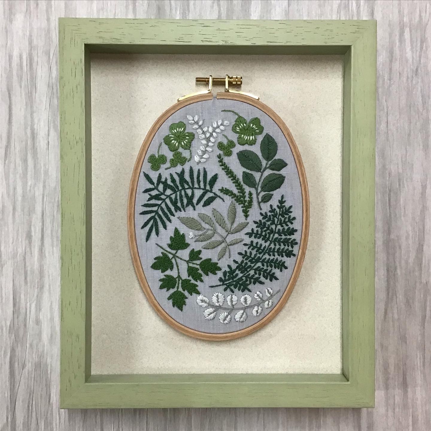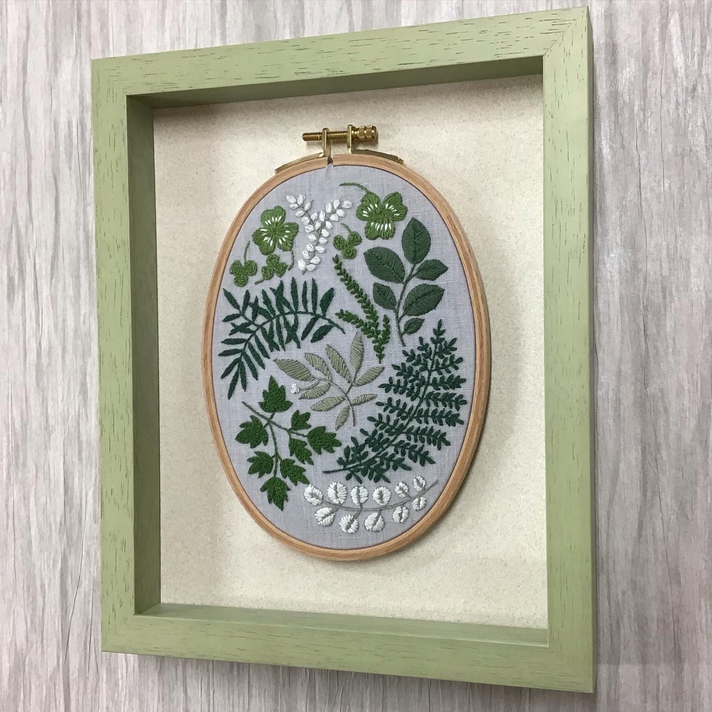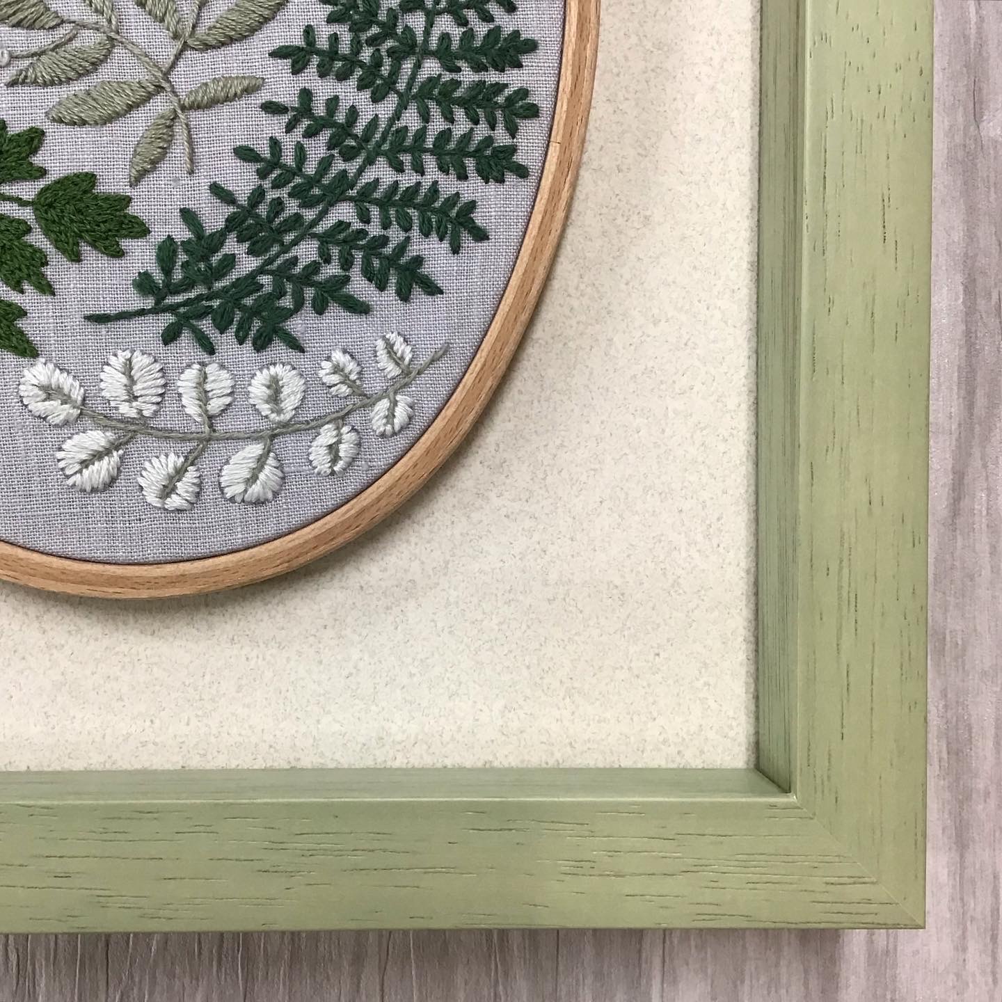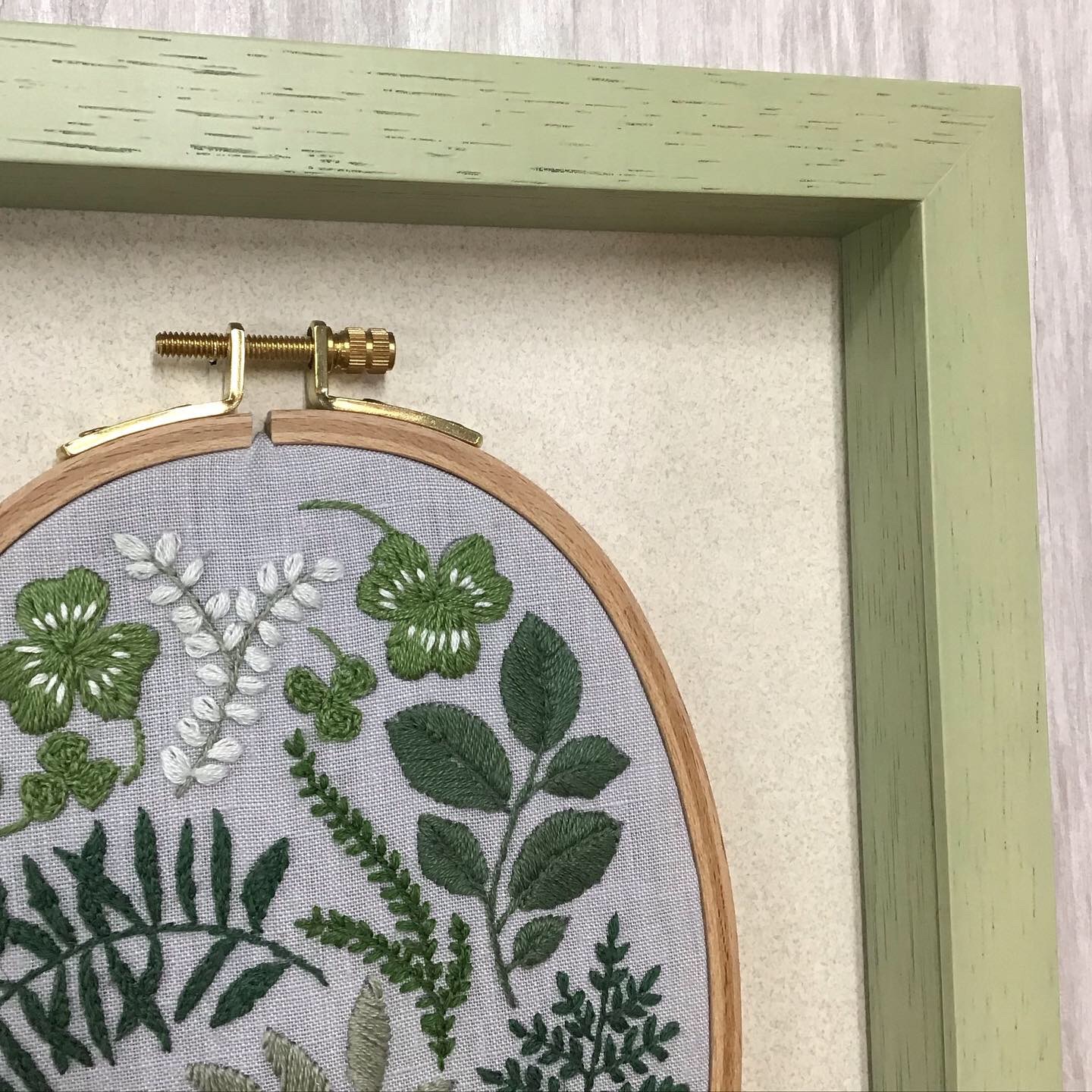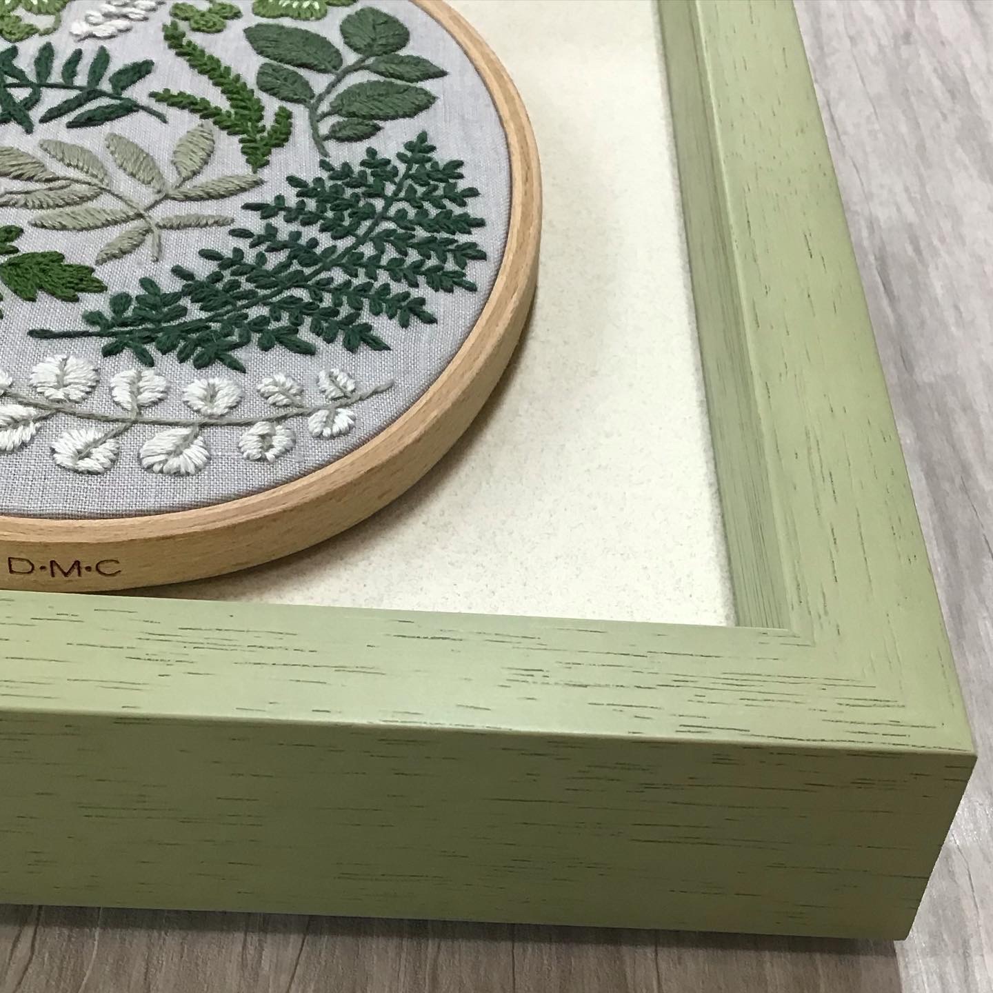 刺しゅうをフレームごと額装をしました! お客様ご自身から、枠ごと入れるアイデアをご提案頂いての額装です。 上部は目立たない位置で枠部分を背景マットに針金固定、下部は布部分を表に見えないように糸で掬い取って固定しました。 小作品でしたので、布を掬うような方法でも固定可能でしたが、サイズが大きい場合は別方法で固定をしたほうが良いかもしれません。 余った布を糸でまとめて刺しゅうの後ろに収納して頂いてあったので、刺しゅう部分にふっくら感が出ていてとても可愛らしい仕上がりになっています。 額は「立体額7916希(のぞみ)」のインチサイズ、マットは自然な砂地模様の「19002コルク」を使用しました。 お客様ご自身は緑色が大好きとのことで、刺しゅうに使われた様々な緑色に加え、額もグリーン色を選ばれ、とても爽やかで優しい雰囲気の仕上がりになりました。