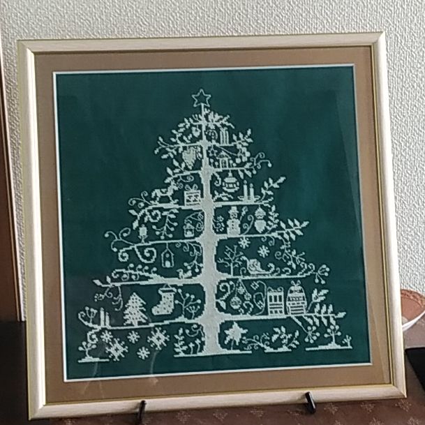 クロスステッチの作品。クリスマスらしく、マットの色をゴールドにしてみました。額縁は刺繍糸に合わせて明るい色にしました。