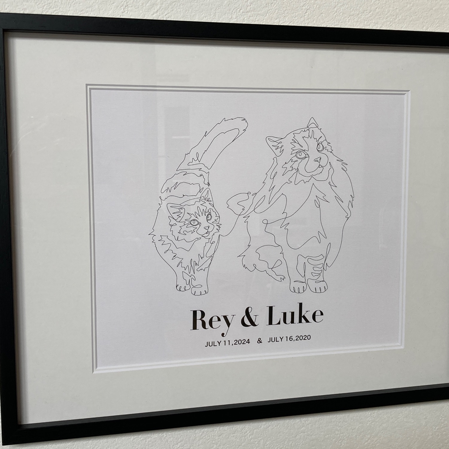 愛猫2匹のラインアートを額装しました。 ブラックフレームとホワイトのダブルマットにしてシンプルで良い感じになりました。