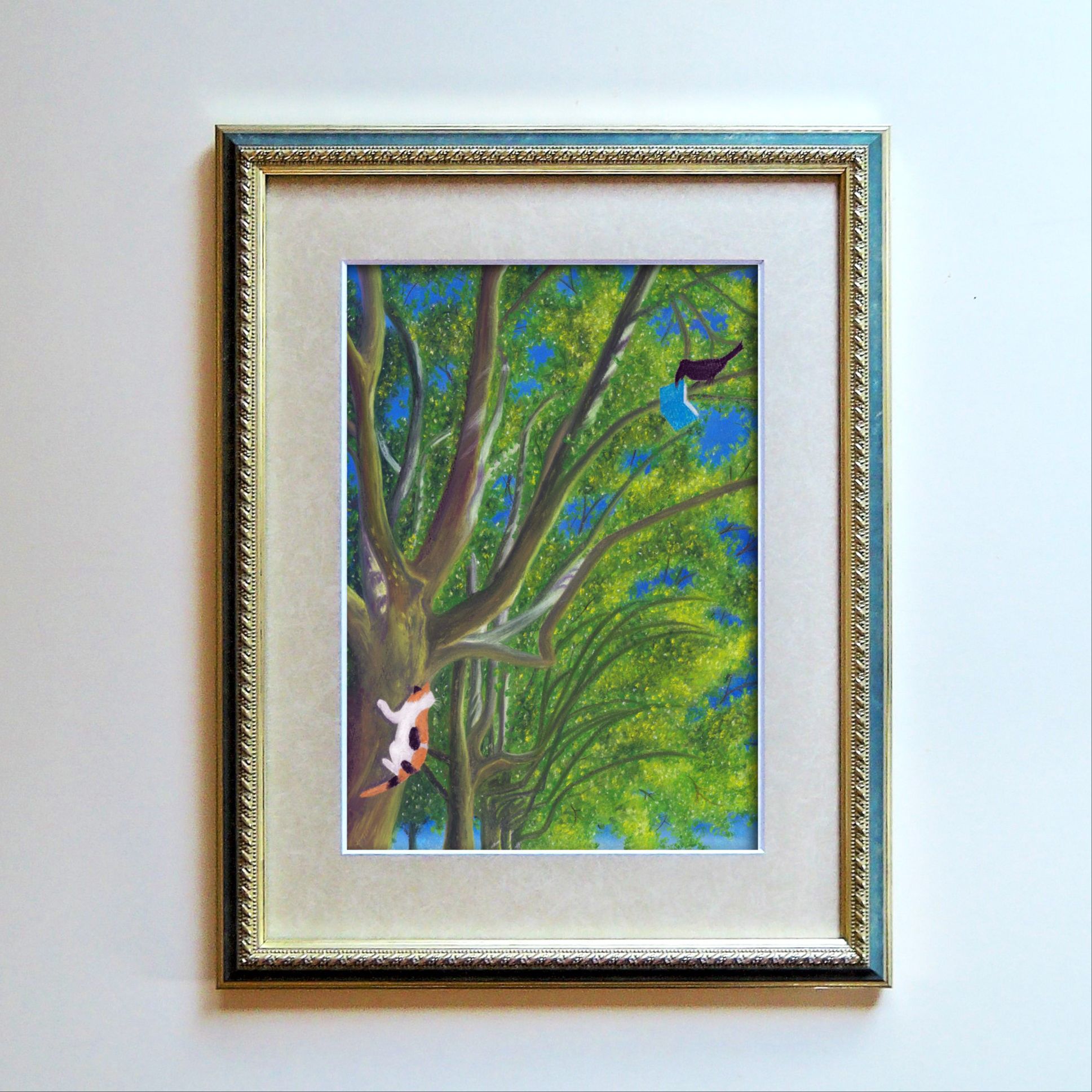 ソフトパステル画の額装です。これから制作するアニメのキービジュアルの一つ。ブルーとグリーンが多用されているため、額の色をどちらに合わせるか迷うところですが、あれこれシミュレートした結果、ブルーにしてみました。真っ青なブルーではなく、彩度低めのくすんだ青なので、グリーンともぶつからずちょうどいいバランスかなと思います。