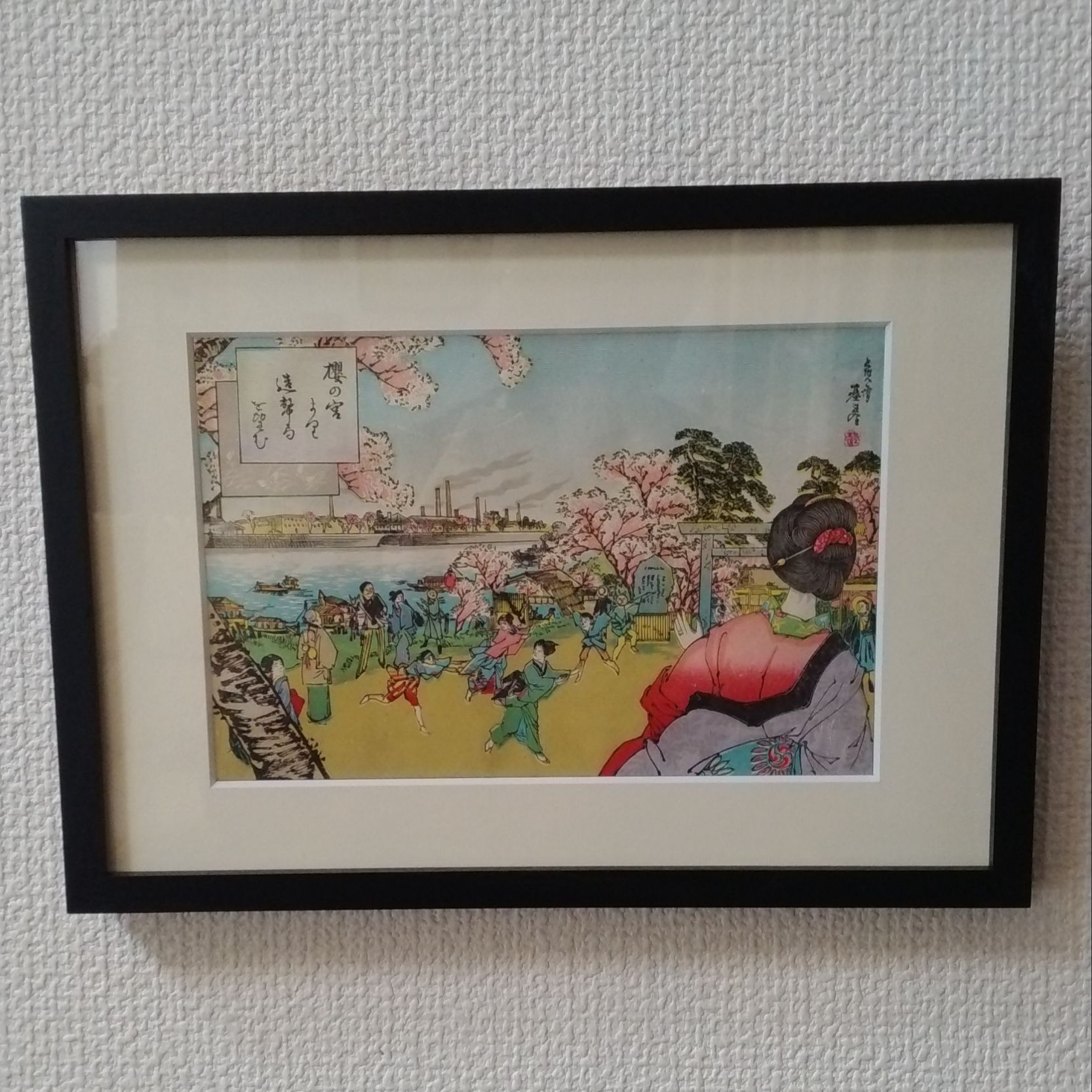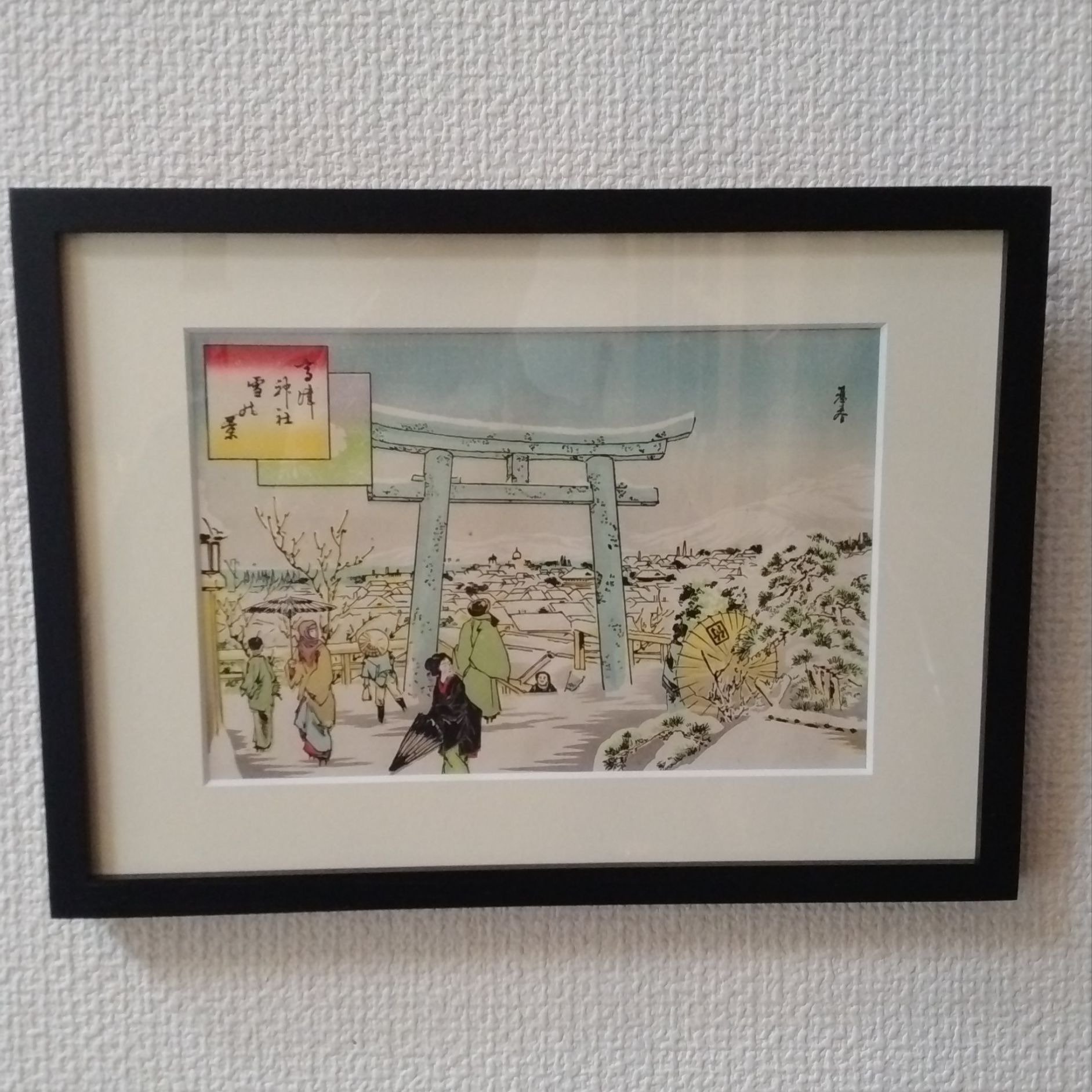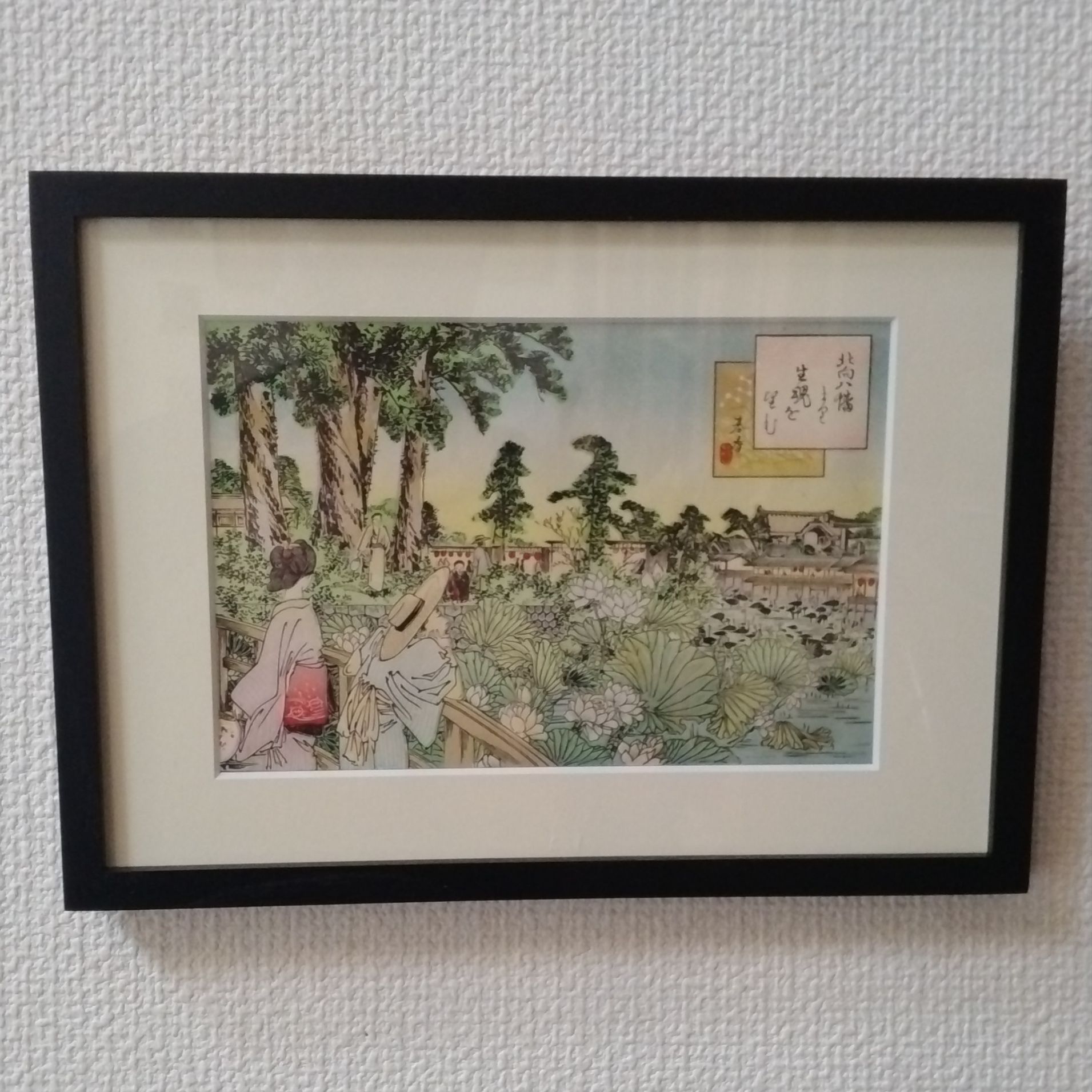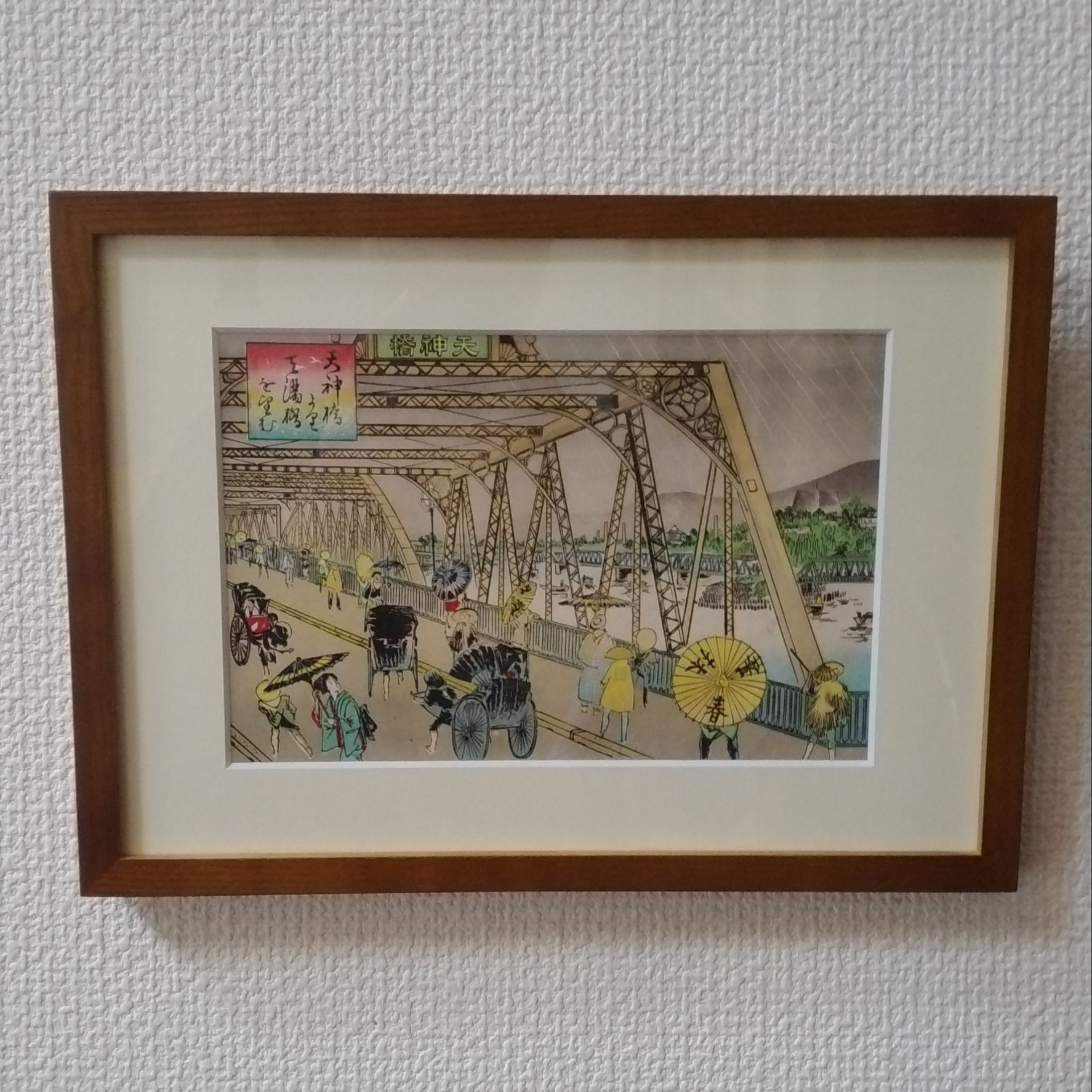 骨董市で購入した明治時代の大阪や京都名所図会という浮世絵を額装しました。 差し色になるフレームをつけることにより絵が引き締まり見応えのあるものとなりました。
