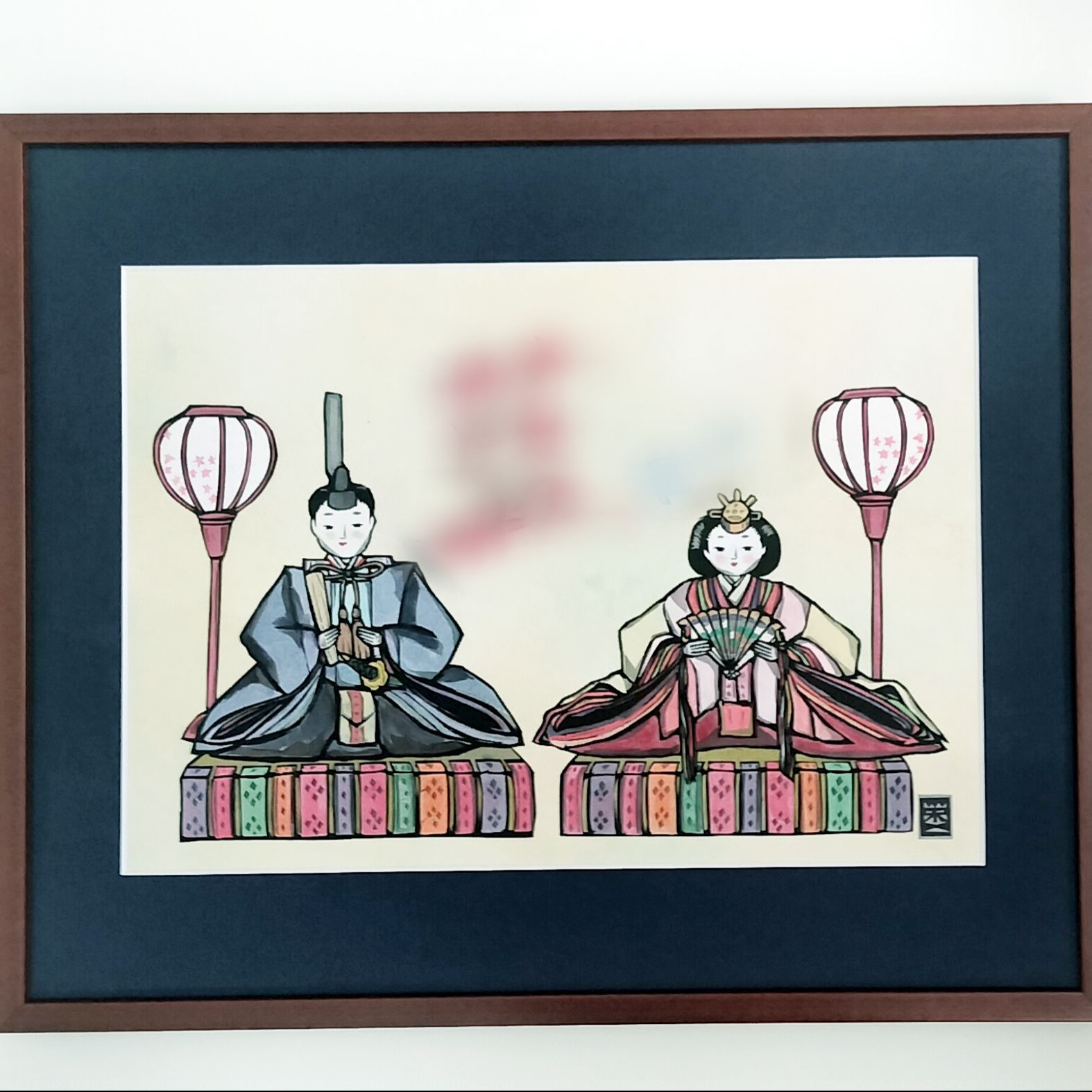 今回はお子さんが生まれた家族からの依頼で真ん中に名前の入ったお雛様の切り絵を額装しました。マットは濃紺で作品を引き締め、額縁は5767Nのブラウンの額を使用。 細めの木製の平型のシンプルな額縁ですが作品を上品引き立たせてくれました。依頼者も大変喜んでくれました。 豊富な種類、色があり、値段もお手頃なのに質が高く、感謝しています