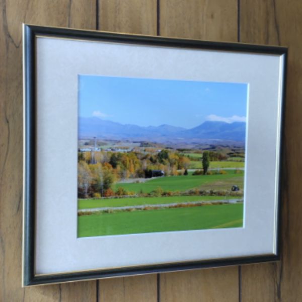 額縁はBH18Fグリーンですが黒っぽい仕上がりで、マット紙は白く見えますが、もみ紙白でうすいクリーム色です。 薄めの額で内、外側に金色の縁が入り高級感があります。