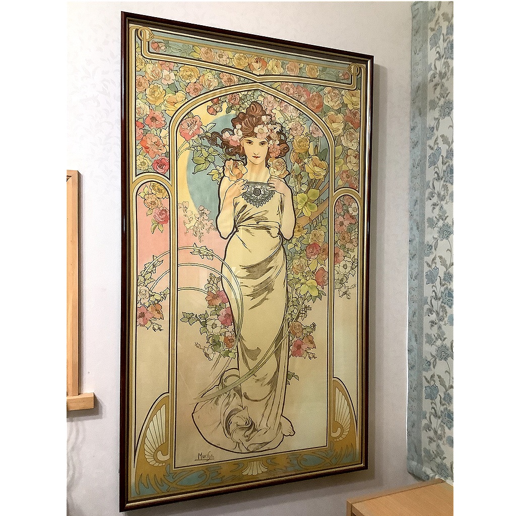 百貨店で見つけたミュシャの生地「四つの花・薔薇」カットクロスは110×60cmあります。 ネットで注文するとき、画像をアップロードすると選んだ額で確認できるのが良いですね。 特注の額は、イメージどおりで作品が引き立ち、美術館にいるような雰囲気になりました。