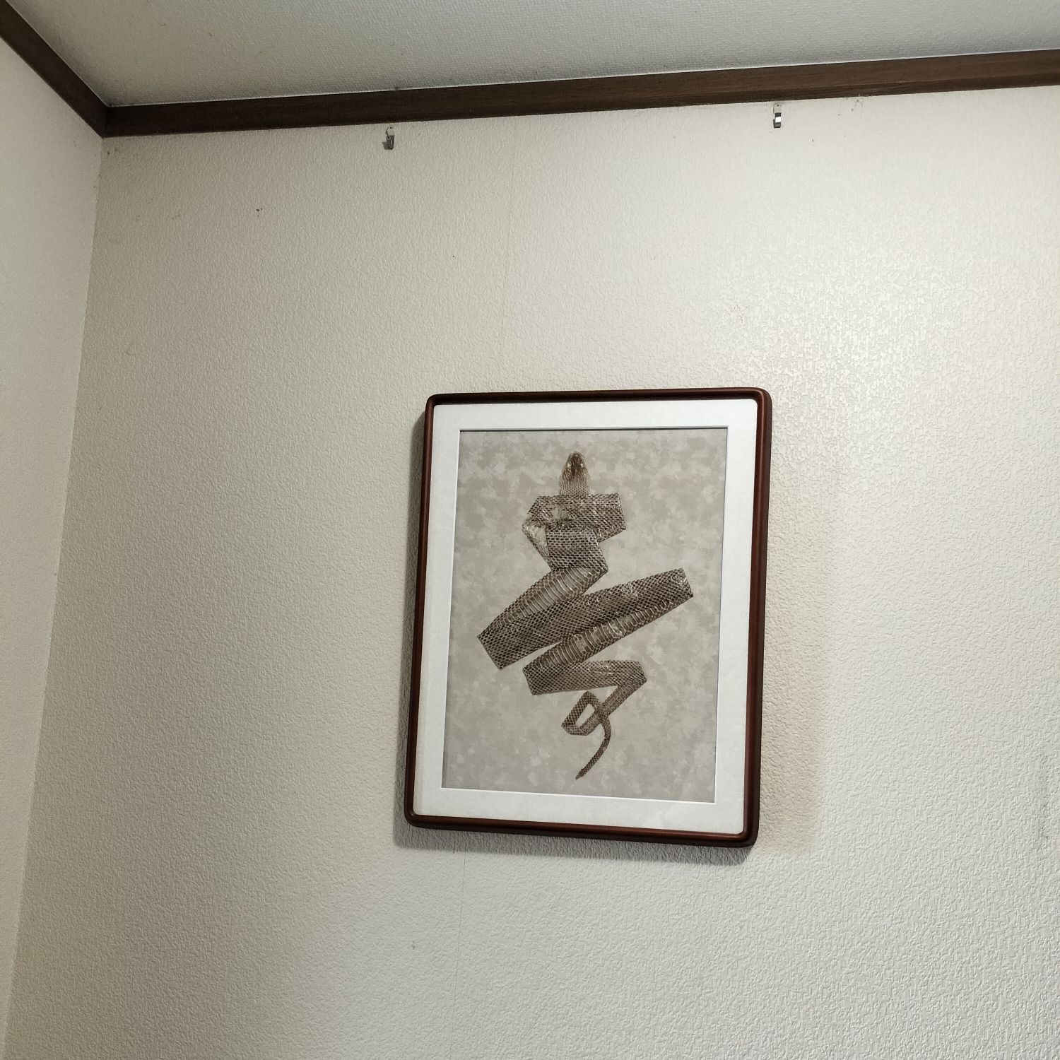 昨年の夏、以前からその存在だけは知っていた大きな青大将が初めて我が家のテラスの片隅で脱皮しました。見事な大きさを何とか活かしたいとあれこれ検索して、たかはしさんに額装を依頼する事にしました。脱け殻の長さによる規格と飾りたい場所に相応しい額の大きさが合わなかったので、メールで相談したところ大変丁寧に対応してくださり、希望を叶えていただけました。仮の見本の写真まで送ってくださったので安心してお任せすることができました。出来ばえには大変満足で、吉日に玄関へ飾りました。壁の廻り縁との色合いも良くマッチしていると思います。