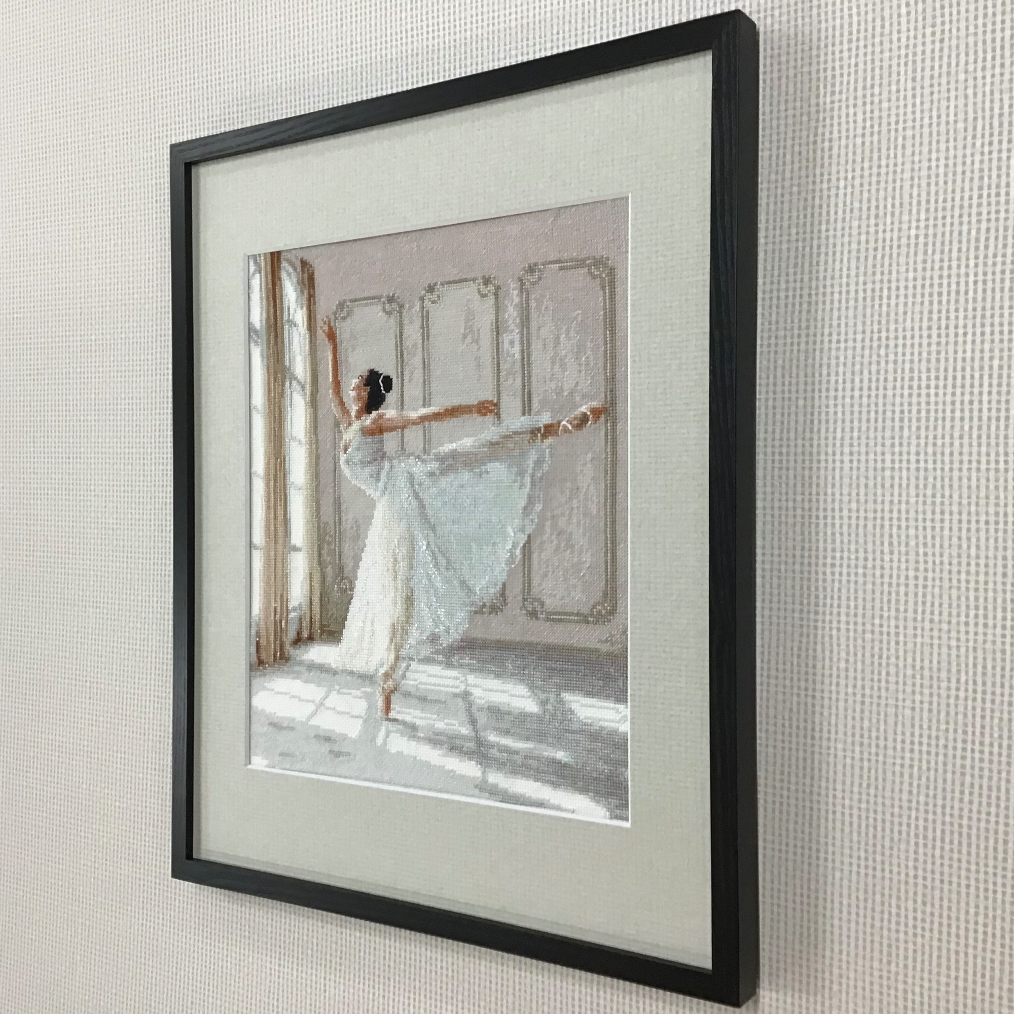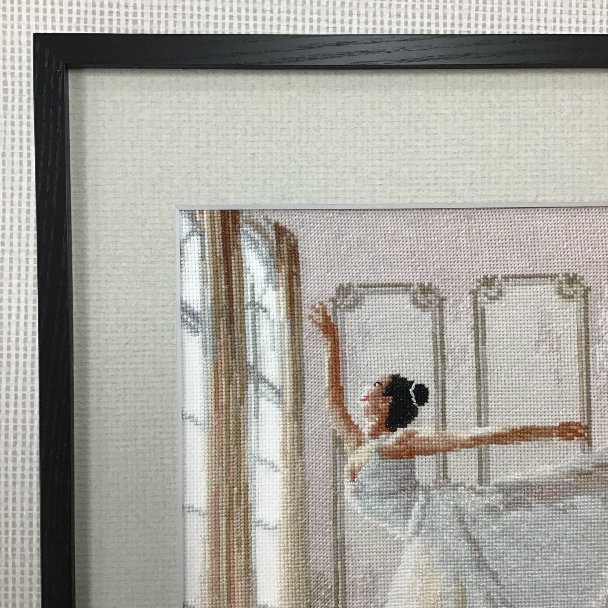 クロスステッチ刺繍を額装しました! 少し前に投稿した「トゥシューズを履くバレリーナ」のクロスステッチ刺繍の続きのような作品で、美しく踊るバレリーナのクロスステッチ刺繍です✨ 使用したフレームは前回と同様「GT501 黒 四ツ」、マットも同じ凸凹した質感のグレー色のマット(19006)を使用しました🖼