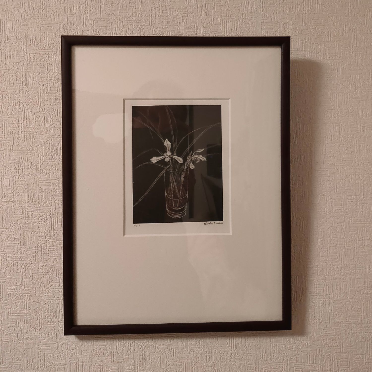丹阿弥丹波子(たんあみ にわこ)さん銅版画家 のメゾチントの作品をマット加工を中心ではなく上側に寄せて窓抜きしてとても スタイリッシュな額装に仕上がっております。