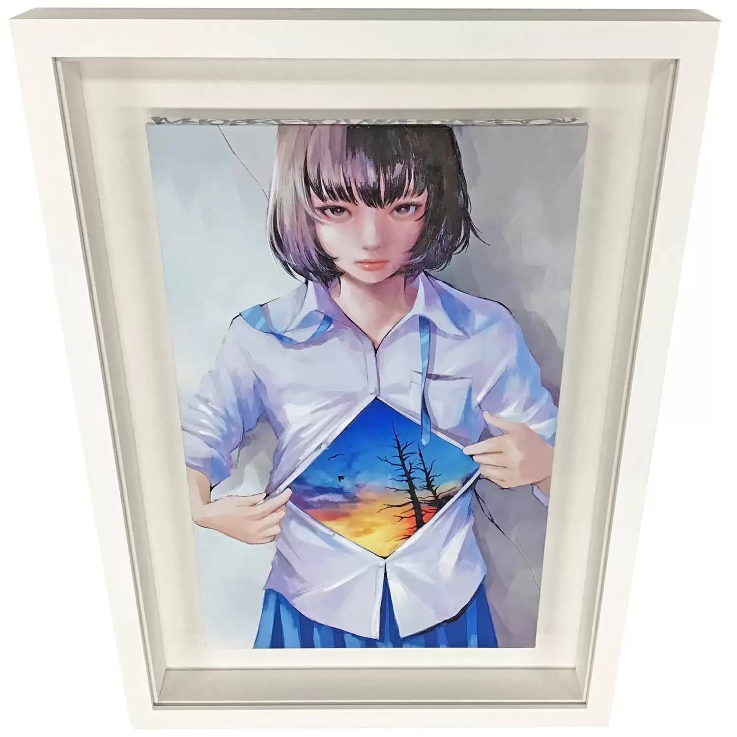 ✨お客様からお預かりした、Watabokuの幻想的なパネル作品を額装しました。 制服を着た少女の胸元が扉のように開き、そこから広がる不思議な世界。見る人によってイメージが膨らむ、奥行きと浮遊感が魅力的な一枚です🎨 今回は、浮かし額装で奥行き感と浮遊感を表現し、パネル裏からネジ止めせずに当社オリジナル仕様で仕上げました。作品を傷つけず、後で取り外しもできるので安心です。 フレームはシンプルな白の艶消し額「18-1052WR」、内布は「36-104 ホワイト」。作品の色彩が際立つ組み合わせです。