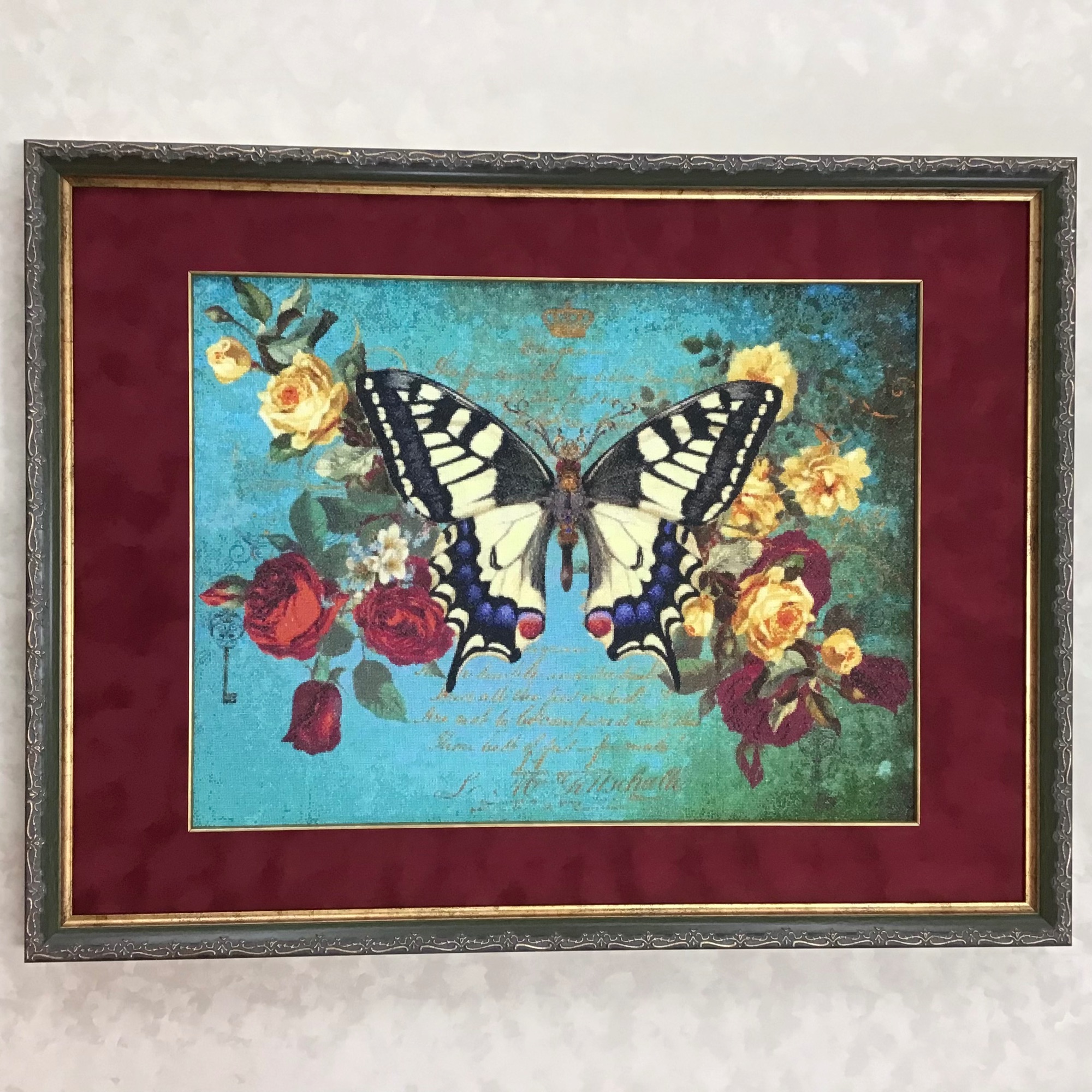 クロスステッチ刺繍作品を額装しました! 羽を広げているアゲハ蝶と赤と黄色の薔薇が綺麗なクロスステッチ作品です✨ 今回は作品の雰囲気に合わせて、「重めな感じで...」とご依頼いただいたので、フレームはグリーンとゴールドのアンティーク彫のフレーム「8214 グリーン 三々」、マットはスエード赤色マット(24605)に面金加工をして、全体的に濃いめの色で額装してみました🖼