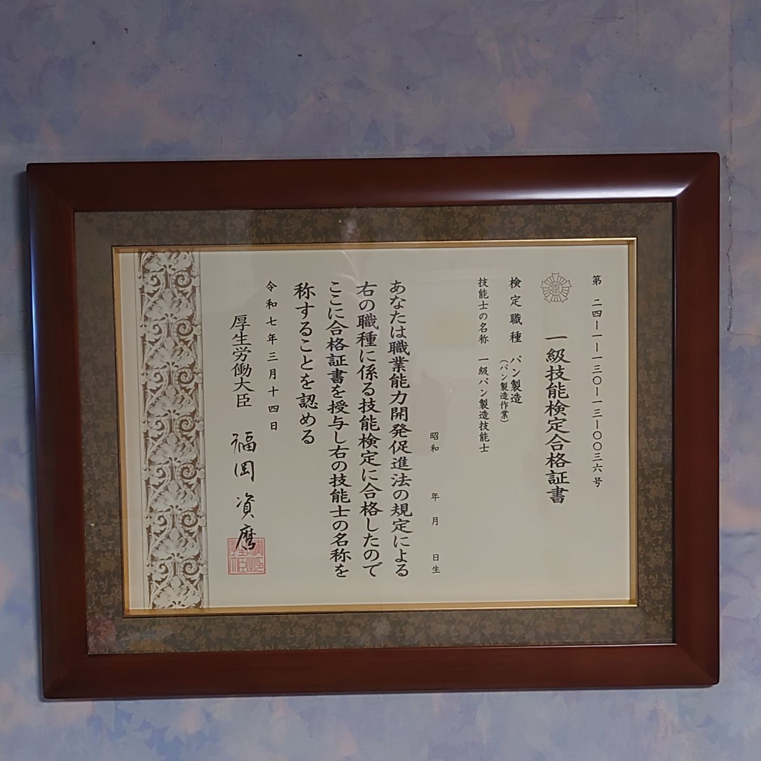 合格嬉しかったので一級技能士合格証書飾ってみました。 ちょと大げさかな