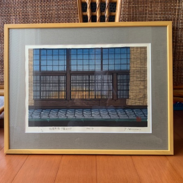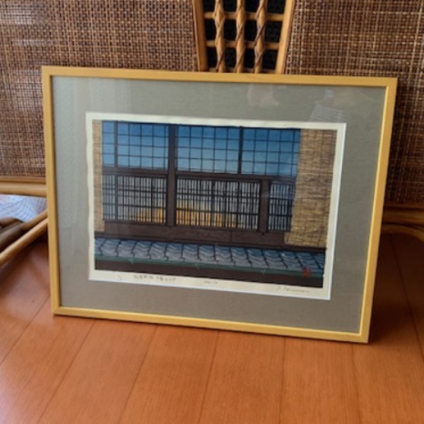 この木版画も友人に差し上げるので新たに額装しました。使用せず保管していた木地のフレームに渋い灰グレーのマットを合わせてみました。
