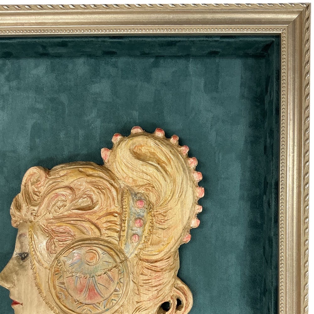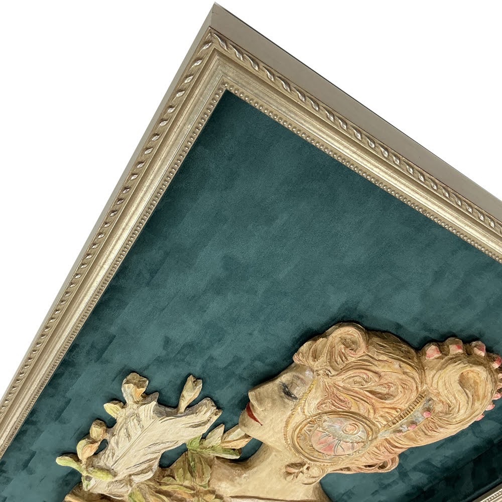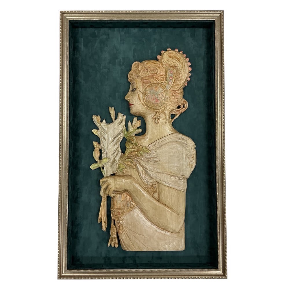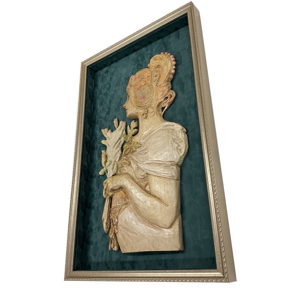 世界的に有名で人気な画家アルフォンス・ミュシャ。 そんなミュシャの作品「羽根」を木彫で表現した作品を額装しました! 女性の緩やかに束ねられた髪や手に持っている羽根などが美しく表現されています✨ 使用したフレームは「Cー20182」でBOX仕様、側面と底面はスエード青緑(50-132)の布を使用して、作品は裏からネジで固定しています🖼