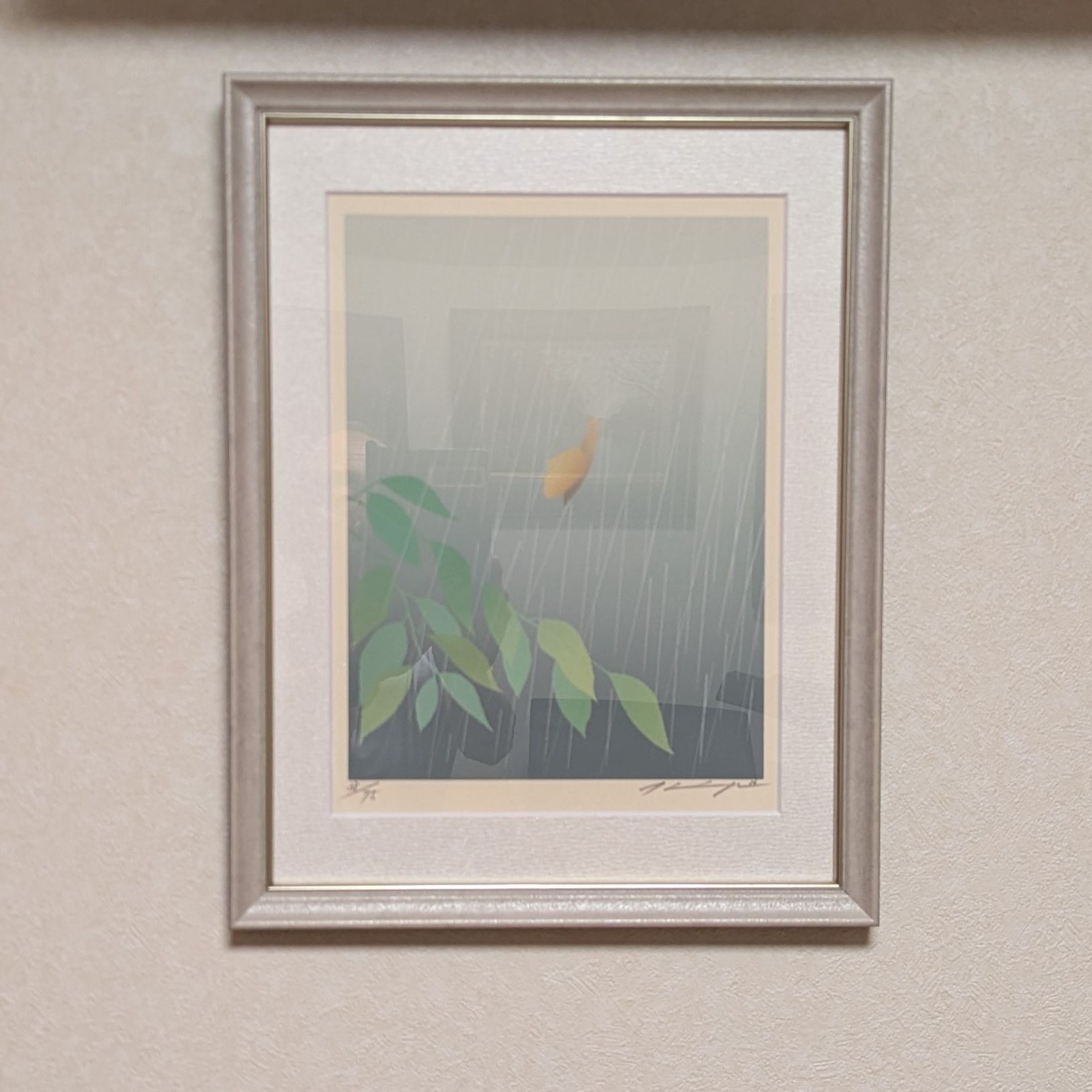 ネットオ―クションで高山成行作「雨路」シルクスクリーン38/75を額縁付き1,000円で求めました。白のアルミフレームでしたが、傷が多く塗装が剥げ落ちているところもあり、白マットにも、所々シミが有りそのまま飾る気には慣れず、複数点額装を依頼するものがあったため、注文総額10,000円超え作戦に投入決定、送料0円。 またまた、シュミレーションしまくりで、飾りやすいようにオリジナルのものより小さな額縁を選び、小さくした分マットにお金を少し掛けることにしました。 UVカットアクリル付きA4ホワイト額縁3,469円に、額装マット標準四角窓真珠704円送料負担が無かったので、締めて5,173円 オ―クションでは、額縁の痛みも有りほぼほぼ捨値の1,000円、実際そのまま飾れないものでしたので、「私によりこの作品は蘇ったのだ。」と自称「目利き」の私の自尊心を高揚させる作品となり、本人的には安い買い物。自己満足の結晶、とくとご笑覧あれ。