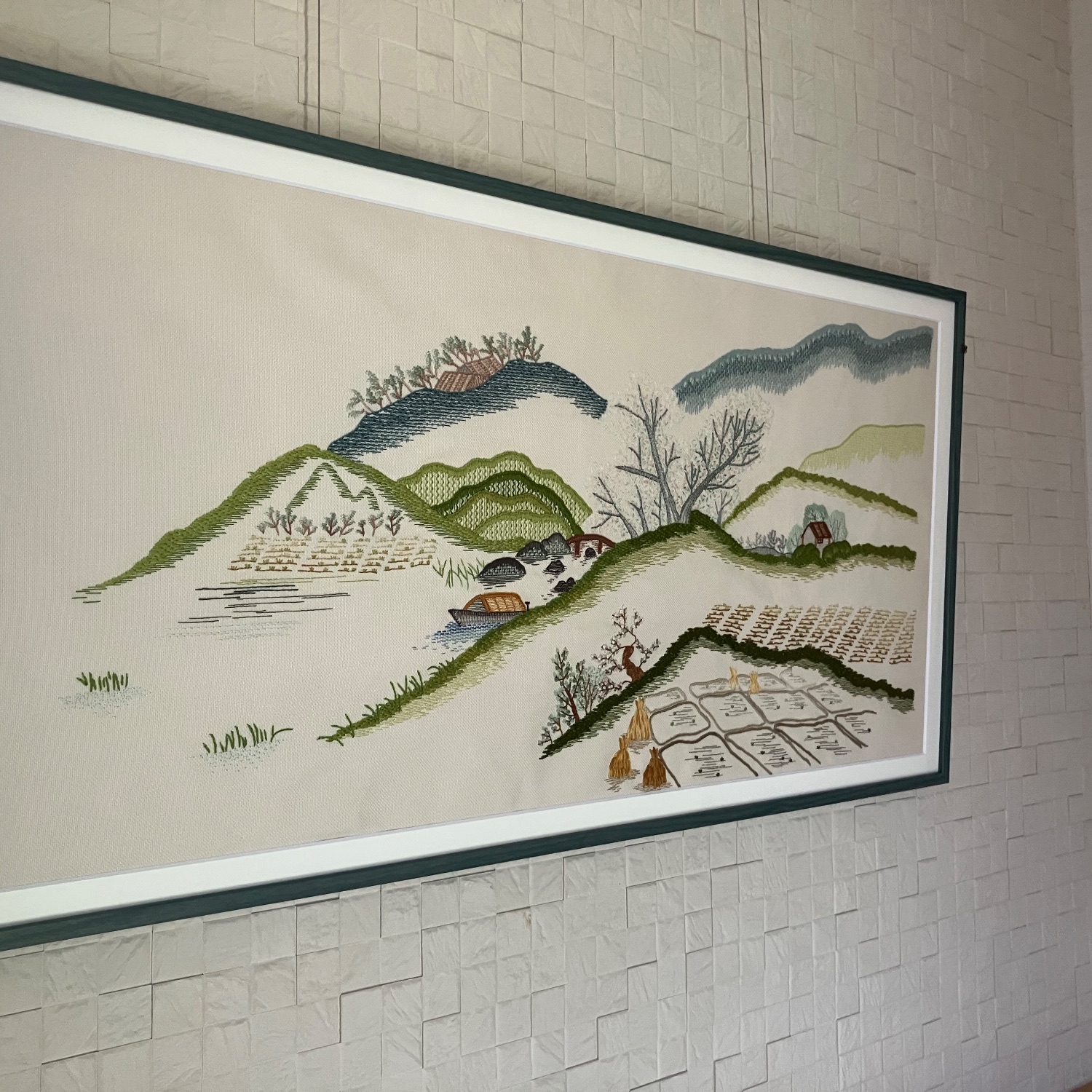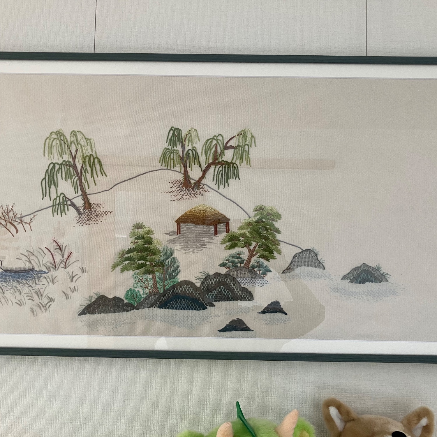 刺繍作品を額装しました。本当は風炉屏風用の図案でしたが、額装にしました。玄関とリビングに飾っています。縦45センチ、横90センチくらいの大きなものですが、いい感じになりました!