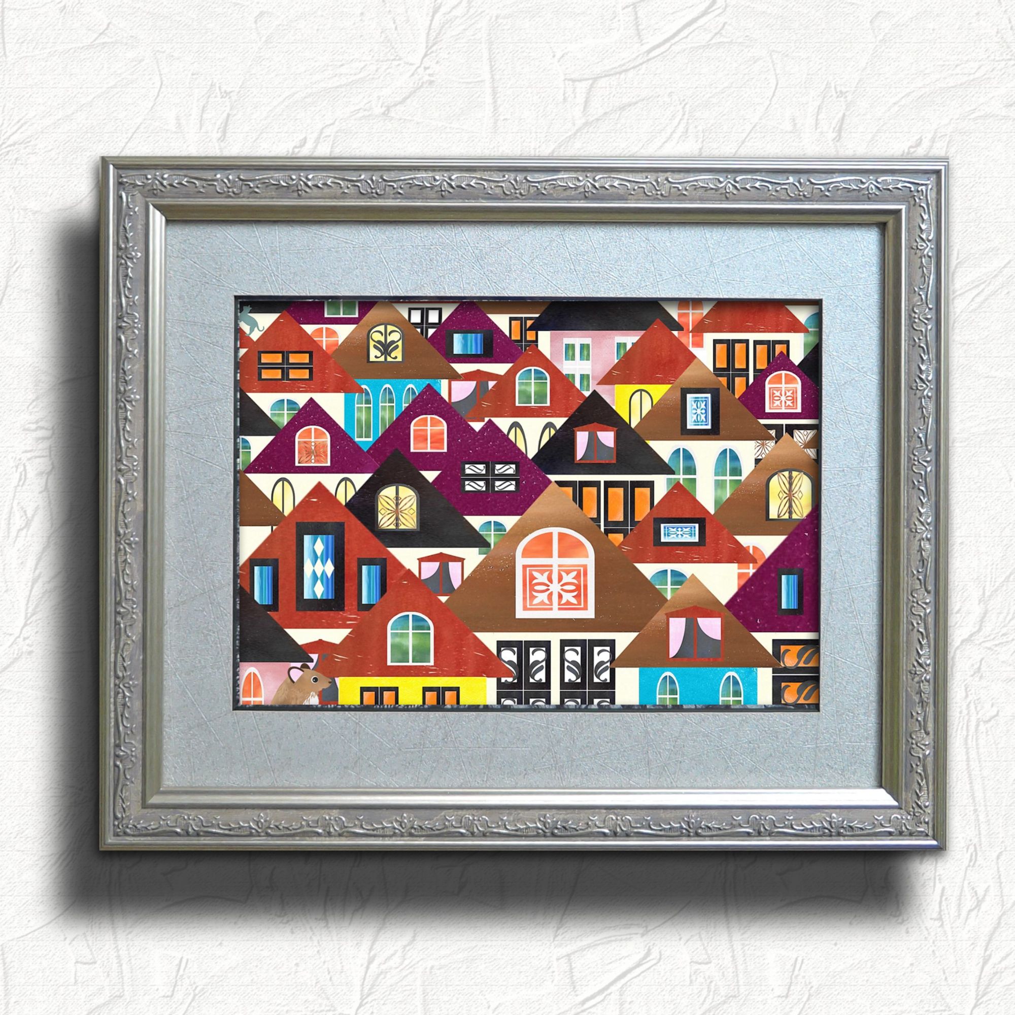 自主制作アニメのスティルを額装しました。 カラフルなシーンなので、額とマットは控えめの色調・デザインのものがピッタリと思います。