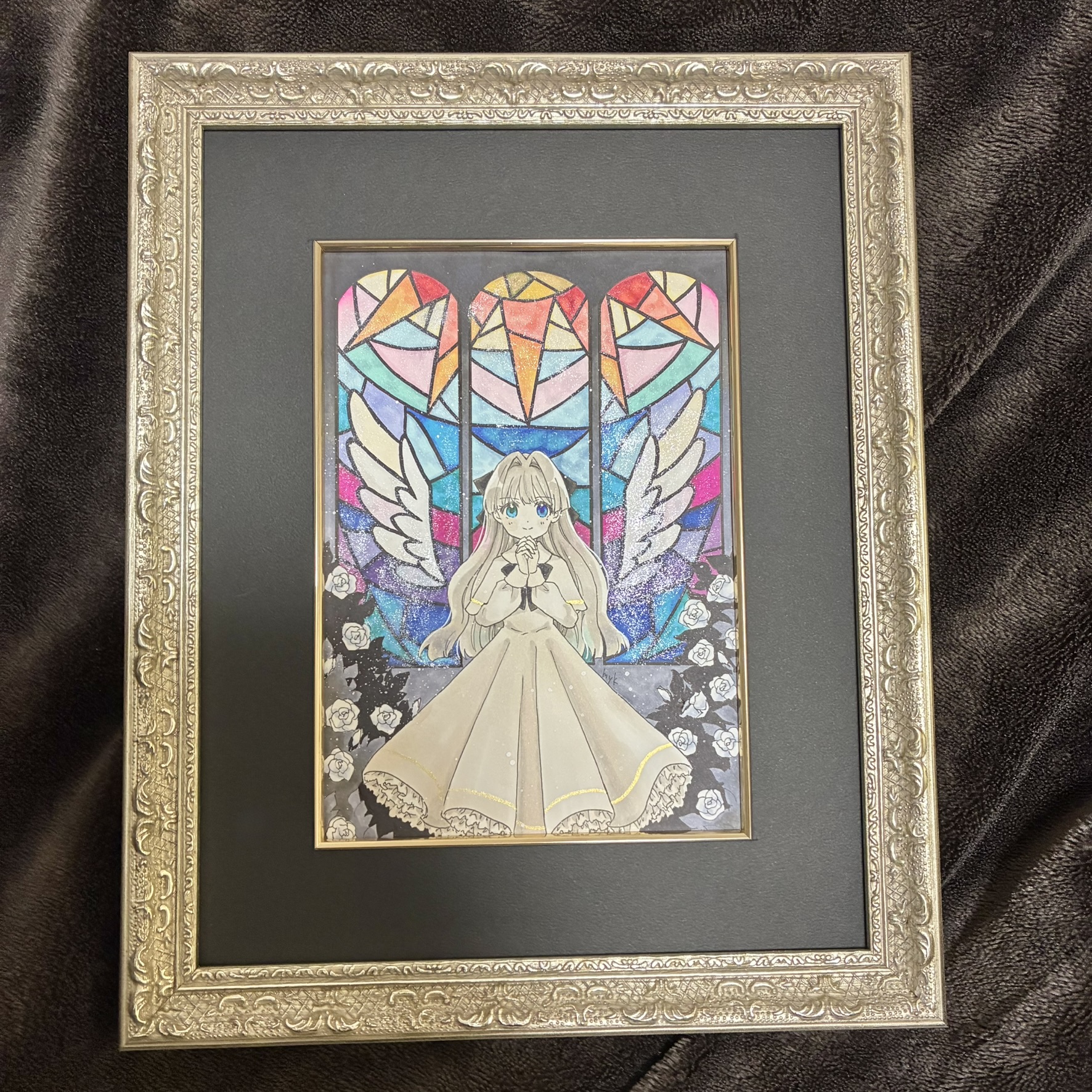 自作の創作イラストを額装しました。◆一般額 8232 UVアクリル付 /203×254(8×10)/シルバー◆額装マット/203×254(8×10)/122×174/面金加工/黒10233/PDゴールド(艶)★