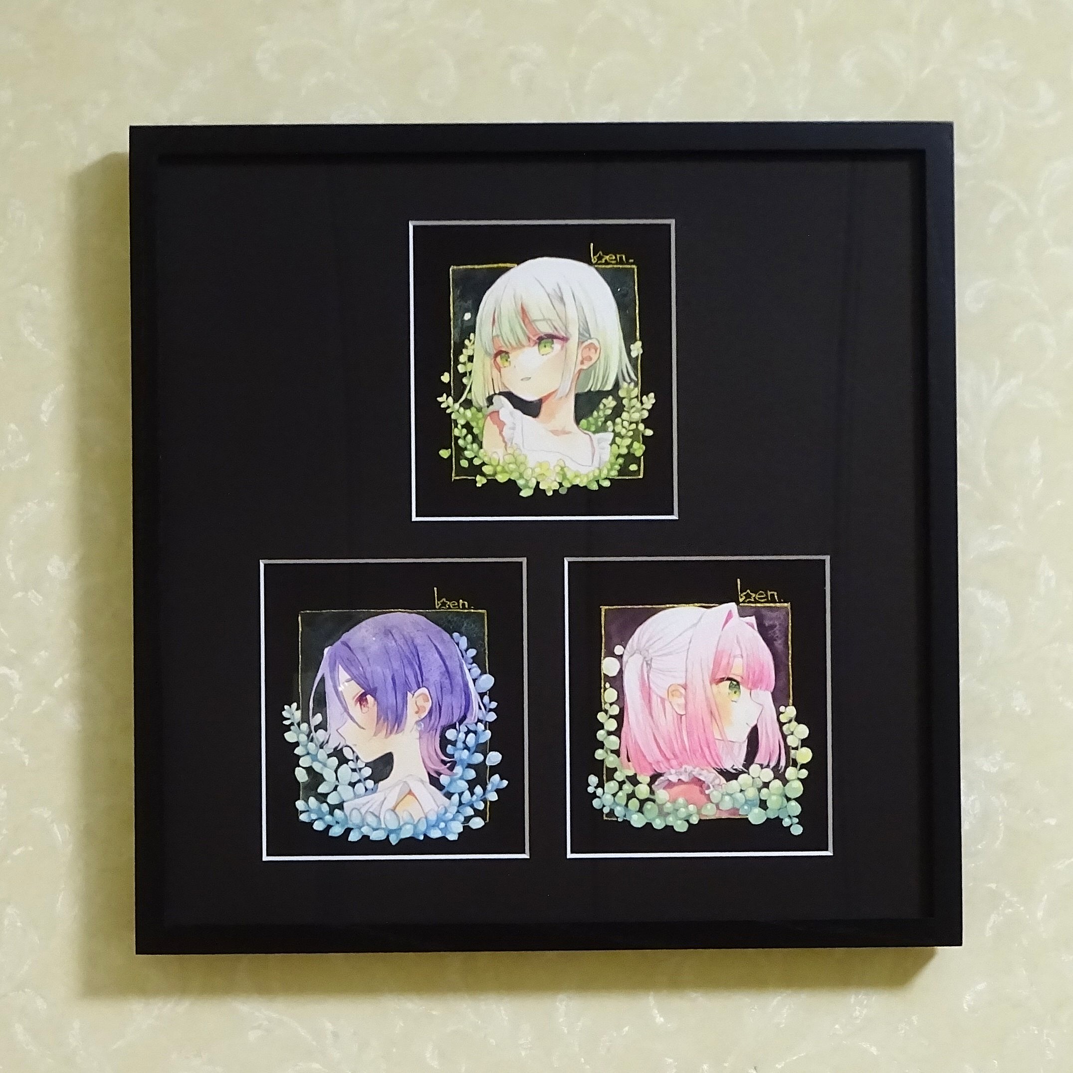 Webで購入した創作の水彩イラスト画3点を額装しました。 窓と作品の配置を考えるのが楽しかったです。 【額縁】GT501/黒/350×350(35cm角)/UVカットアクリル付 【マット】並マット/黒10233/350×350/複数窓抜き加工(3窓)