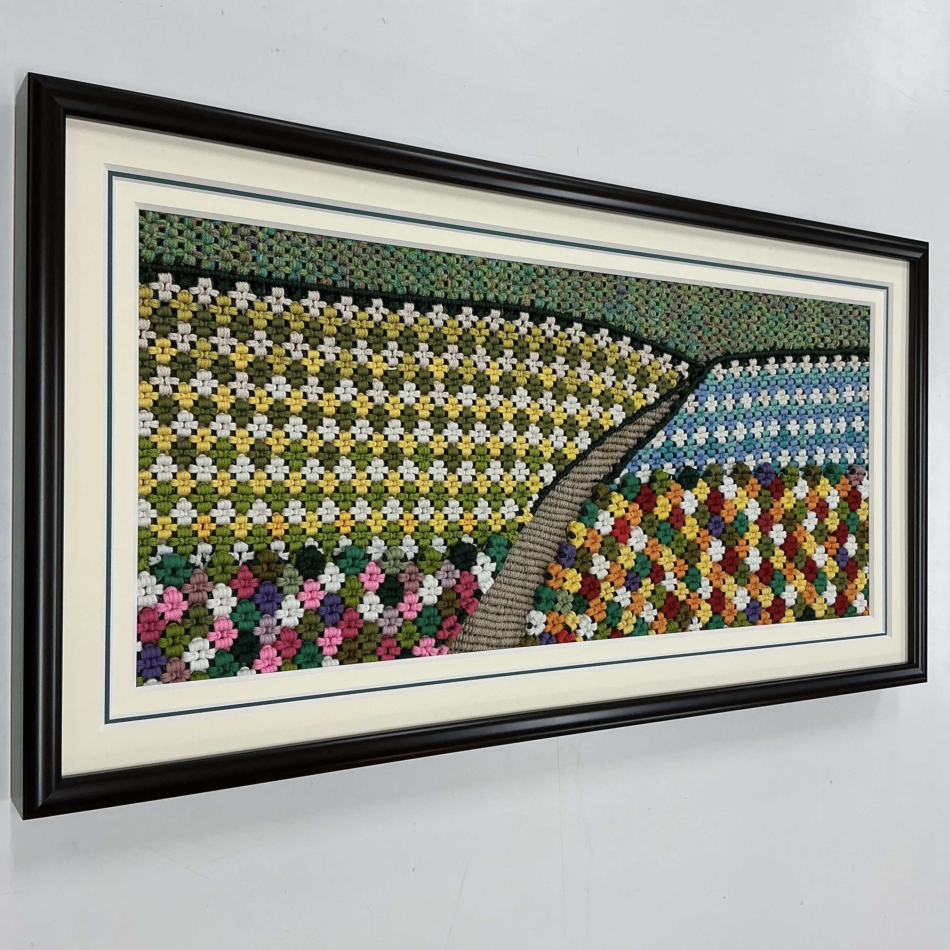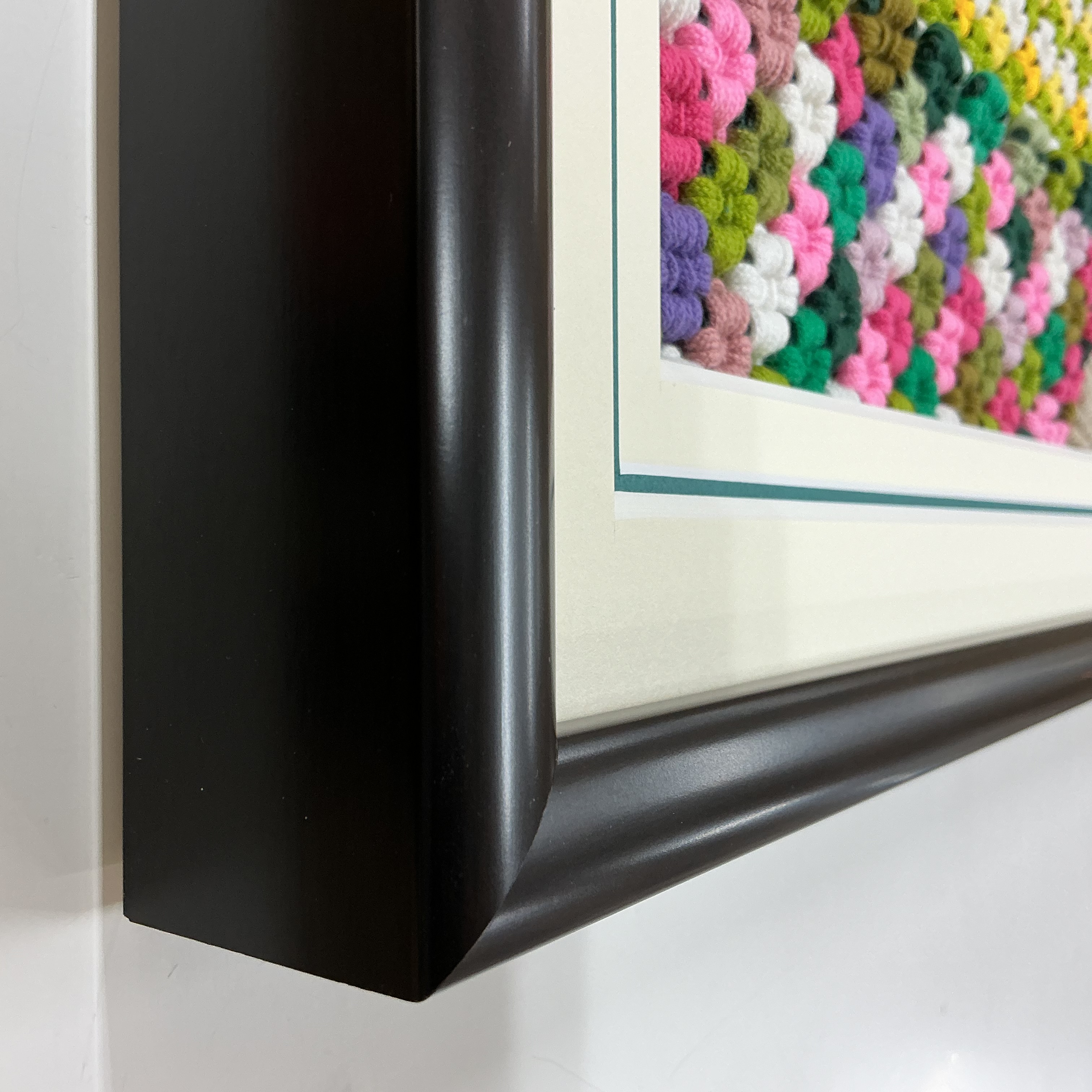 長年ご愛顧いただいている松本店のお客様から、とっても素敵なマクラメ作品の額装をご依頼いただきました✨ 風景をテーマにした色とりどりのマクラメ作品。ふっくらとしたお花の表現や微妙な段差による奥行きが本当に魅力的です。 マクラメは「結ぶ」というシンプルな動作から生まれる、奥深い手仕事の世界。タペストリー、立体アート、そして織物のような仕上がりまで…作り手さんの工夫や個性がギュッと詰まった技法です。 シンプルなカマボコ型フレーム「GT24」に、作品の立体感を活かすため3枚重ねのマット額装で奥行きを出しつつ、作品の色合いを引き立てました。 (3mmクリームマット[廃番]と青緑10465を使用)