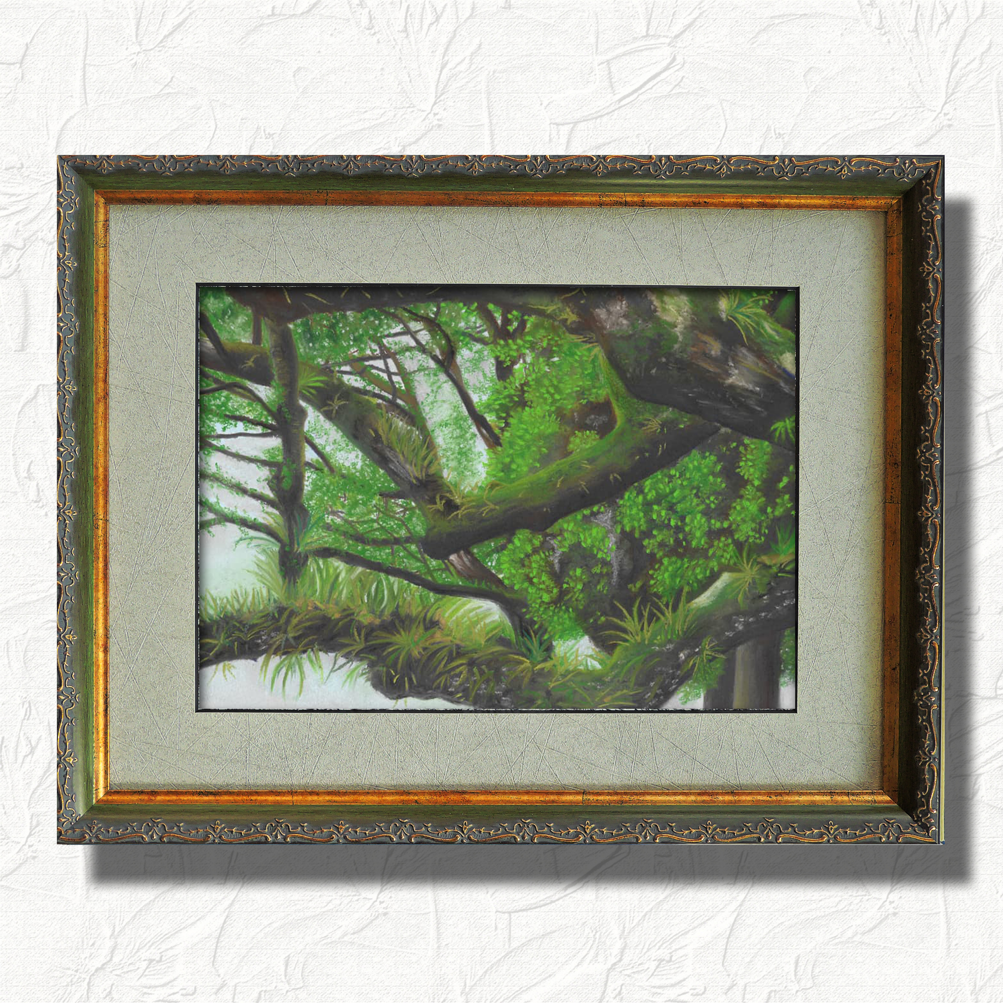 「樹の野生」というタイトルの自分で撮った写真ともとに描いたパステル画です。 深緑のデコレーション額の趣が、苔むした樹の色、絡み合った枝とマッチしていると思います。