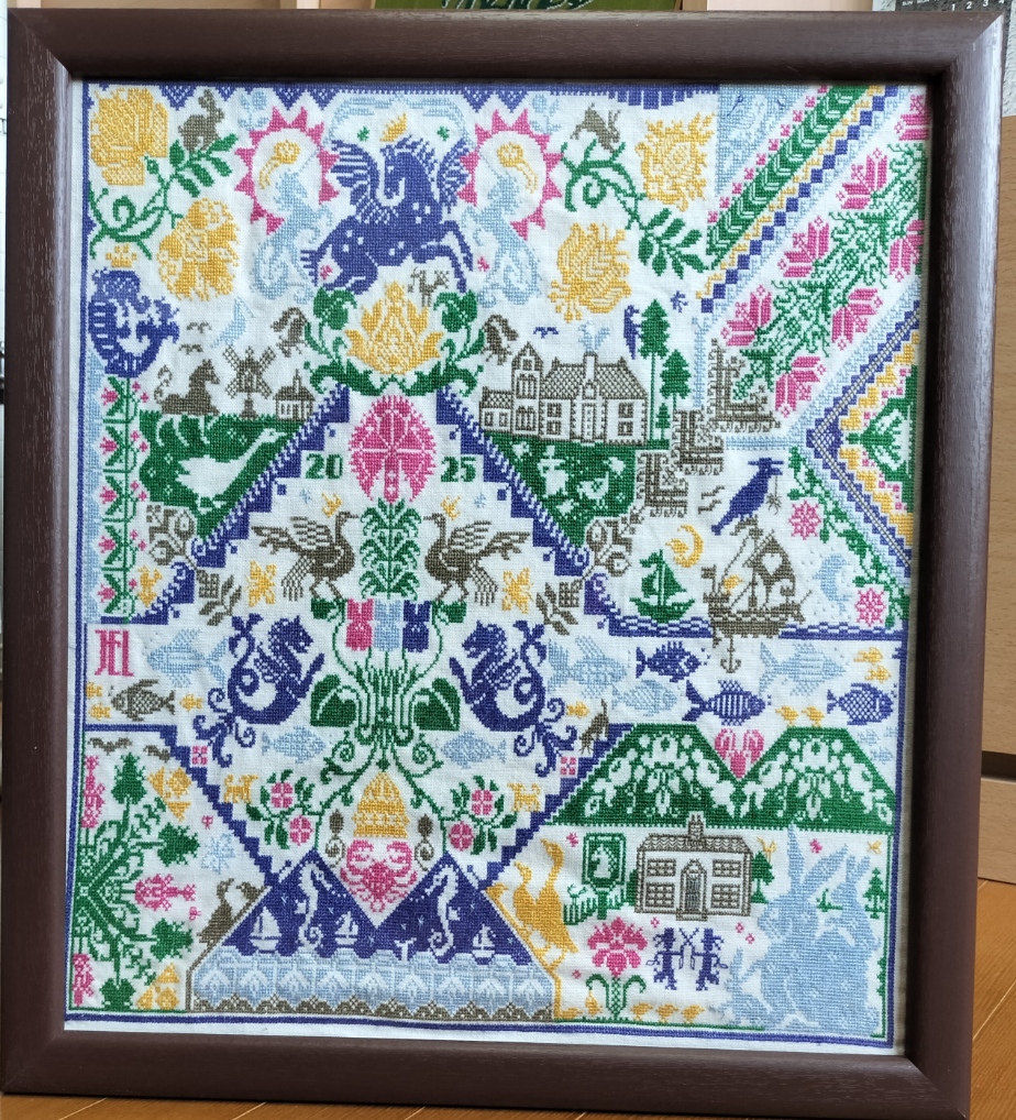 幻想的なモチーフが織りなす刺繍の世界観と、 落ち着いた木目の額縁が絶妙に調和していますね。 作品の魅力がさらに引き立っています✨
