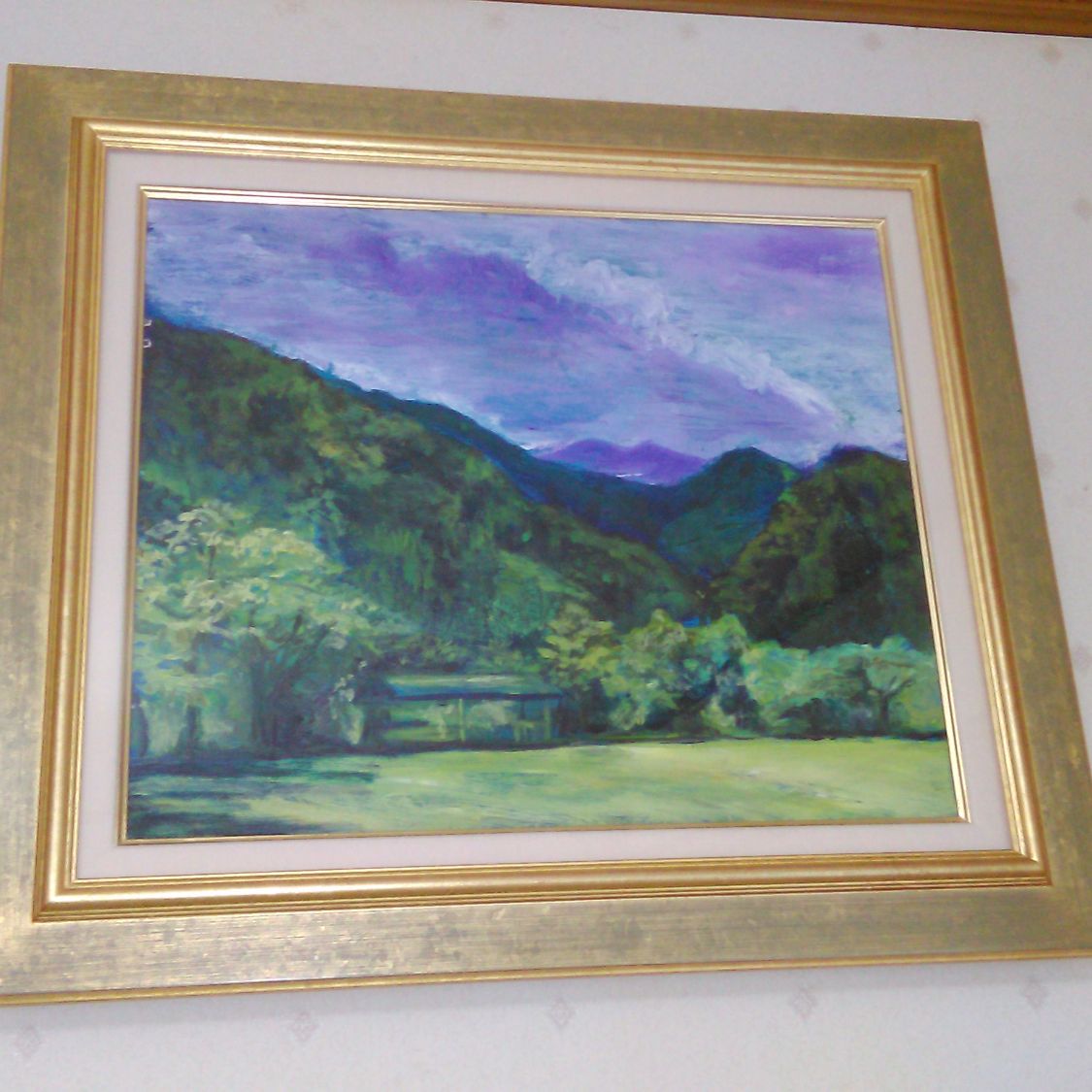 いぶしがかった派手すぎない金の縁が作品の色合いにピッタリです🌳キャンバスやパネルそのままでシンプルに飾る方法もありますが、額があることで作品の見栄えもグッと増しますね✨