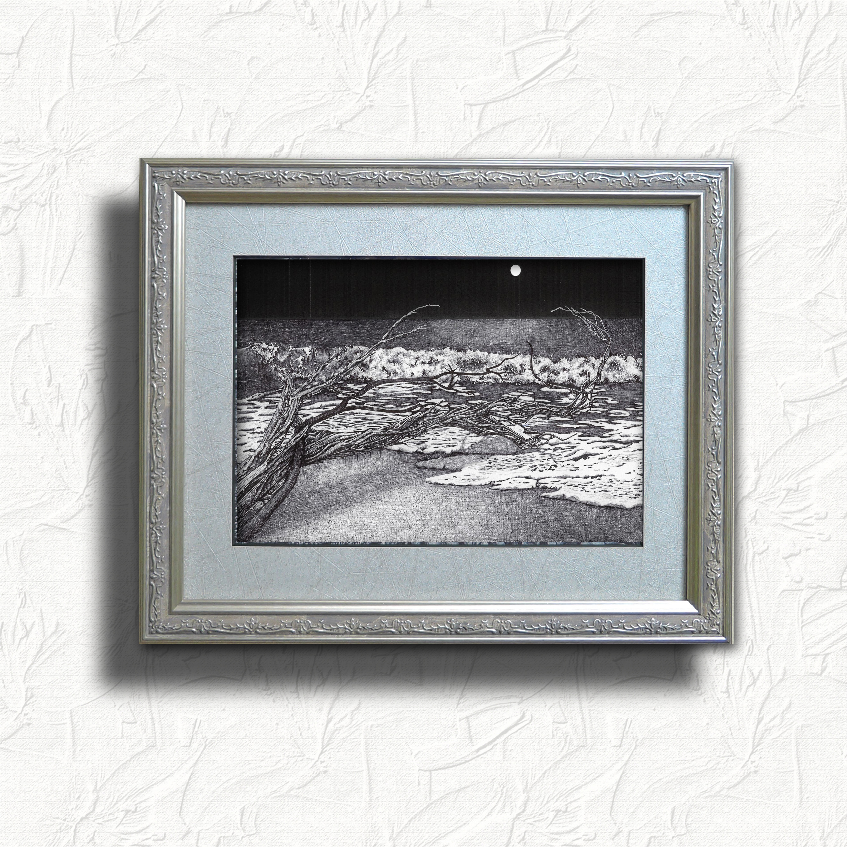 静かな夜の海と月、そして流れ着いた倒木を描いたペン画です。 グレー系とシルバーの額・マットの雰囲気がピッタリで、お気に入りです。