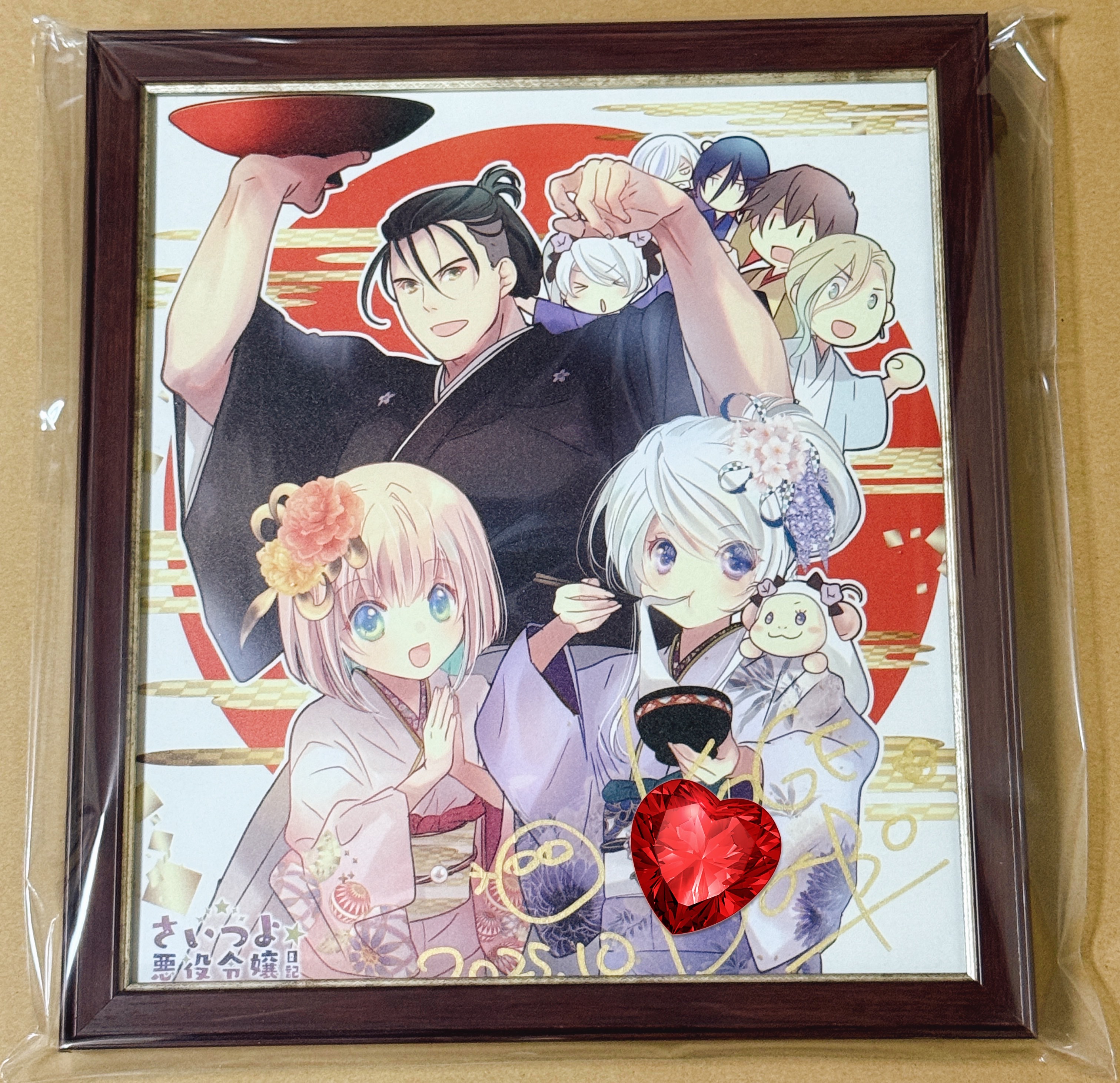 当選したこげどんぼ先生のサイン色紙を「MH-E45J ローズ:RW」で額装しました。 イラストが和なので、和の雰囲気のある額縁の中から、いぶし銀のラインの入った額縁を選びました。イラストに使われている金色といぶし銀のラインがベストマッチでとても気に入っています。