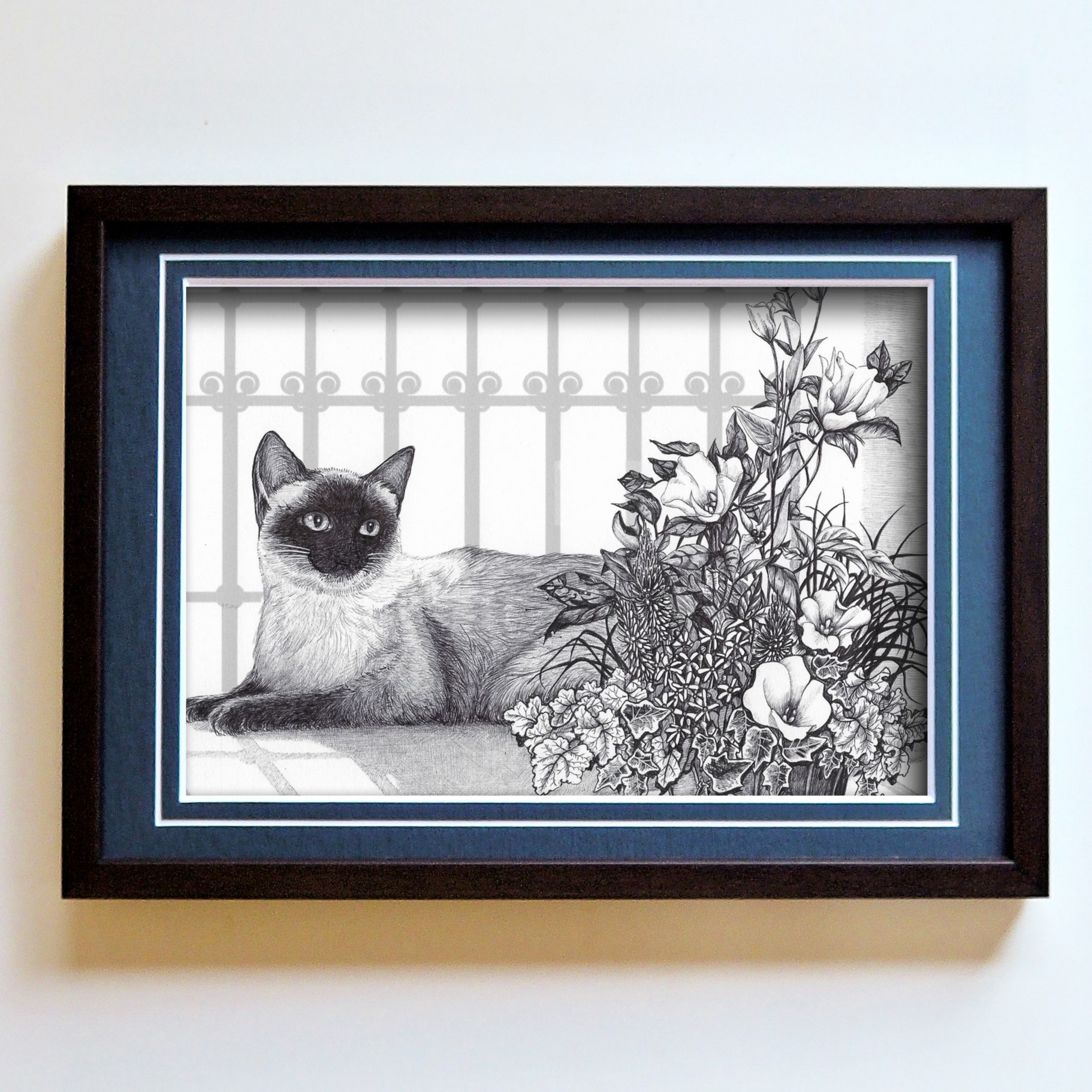 ペン画の額装です。夏の花のフラワーアレンジメントとシャム猫の組み合わせなので、涼し気なブルーのマットを選択。額+絵のしまりがよくなるよう、ダークカラーの額を合わせてみました。