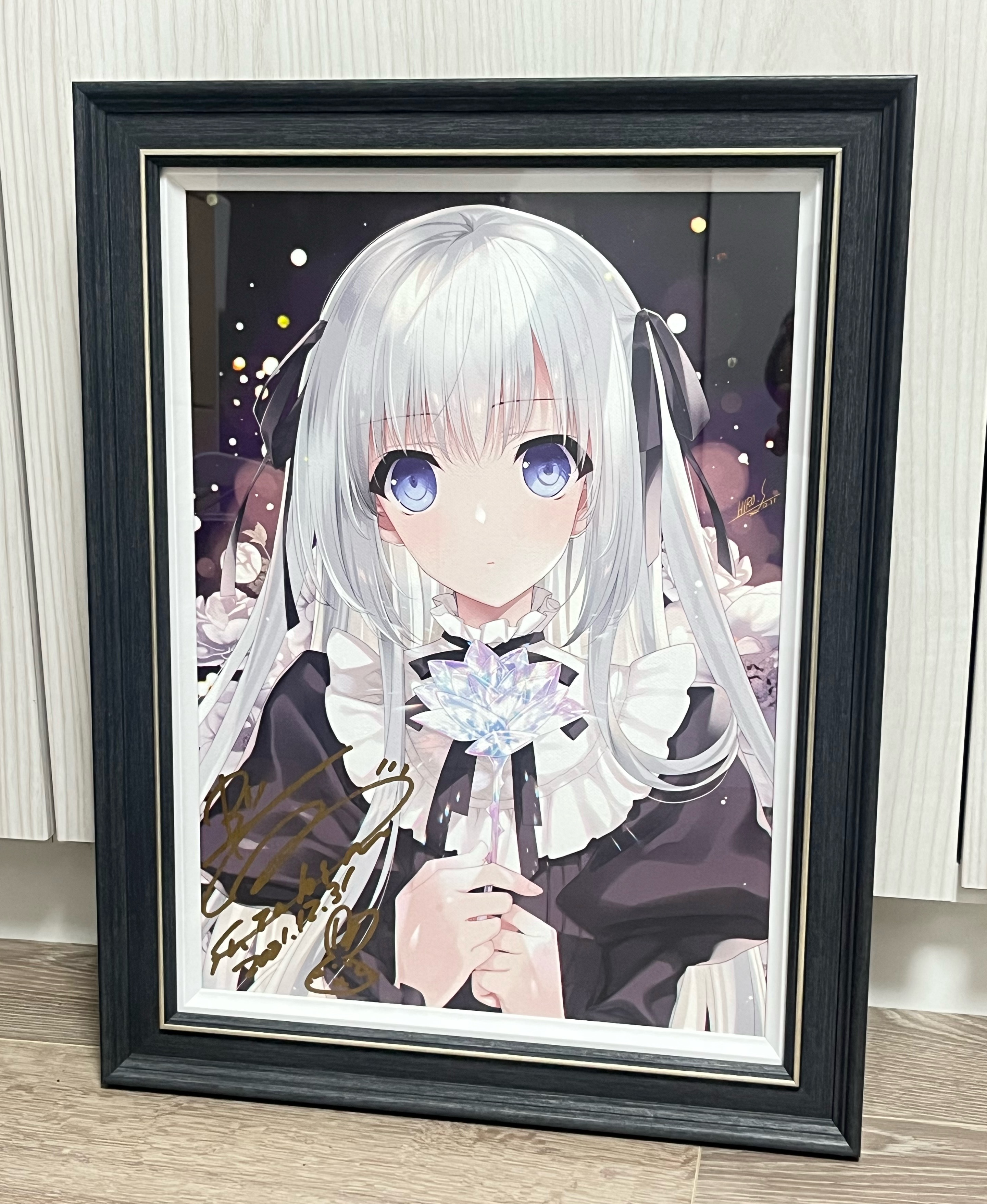 イラストレーター鈴平ひろさんのキャンバスアートです。 2cmほどの厚みがあるためフレーム「SF301グレー」でオーダーで作成しました。 絵の輪郭を強調させるために、マット材はLTホワイトを選択しました。