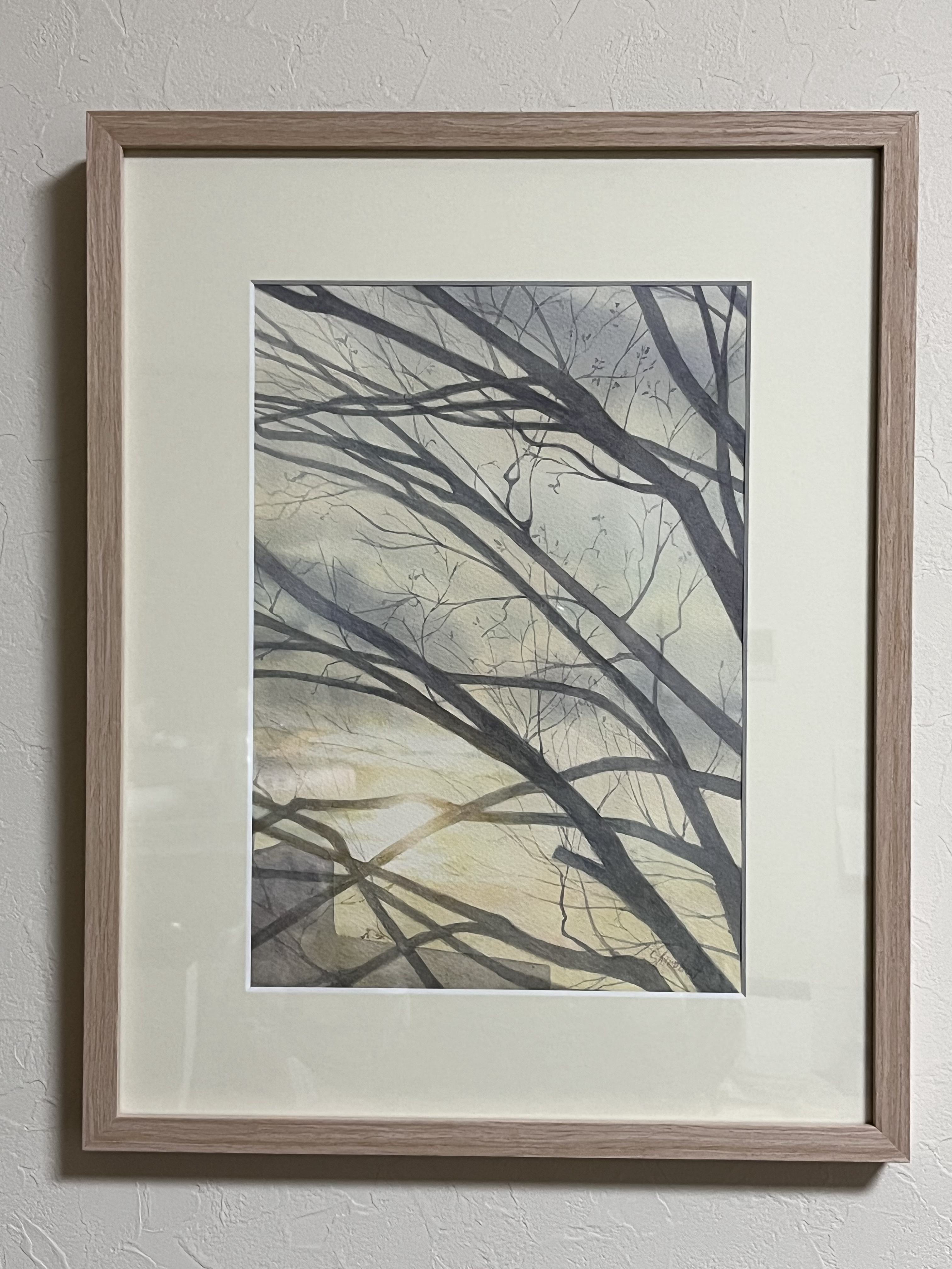 主張しすぎず、自然と馴染むような優しい色合いのマットと木目の額がぴったりです。