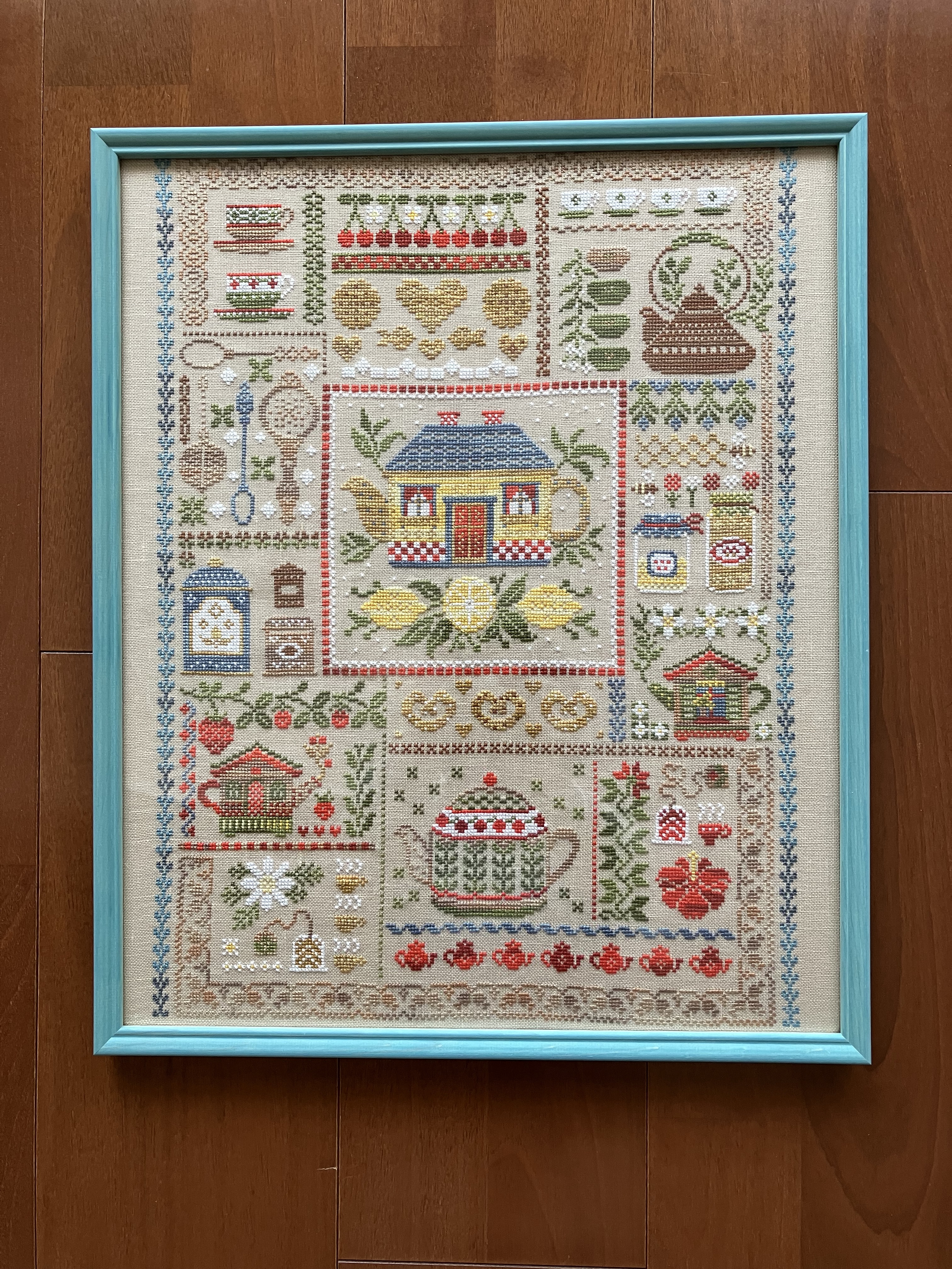 クロスステッチ 色々なデザインが入ってるので額はシンプルな物を選び枠をブルーにしました。