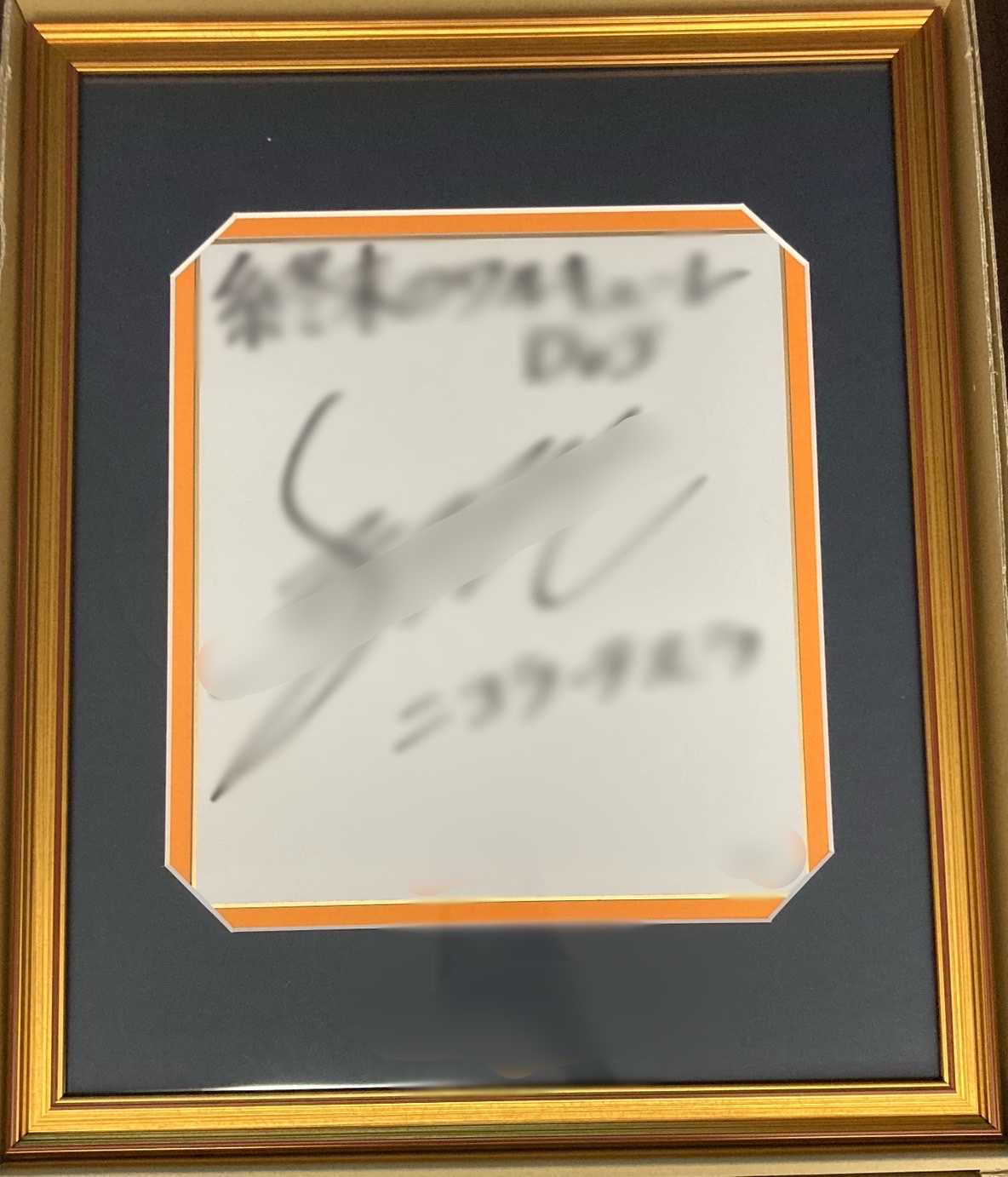 四ツ切の額縁にマットを色紙を端まで見せる加工をしていただきました! サインを隠すことなく飾ることができたので大満足です!! 一般 8169 ゴールド:348×424(四ツ切) 角をおさえるマット:濃紺10468 色紙はめ込みマット:オレンジ10046